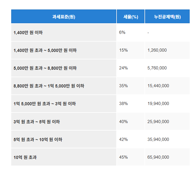 📌 소득이 높을수록 높은 세율이 적용되며, 일정 금액을 누진공제로 차감할 수 있습니다.