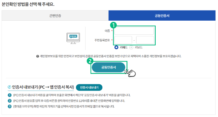 1. 이름과 주민번호를 입력 후 공동인증서 버튼을 클릭합니다.