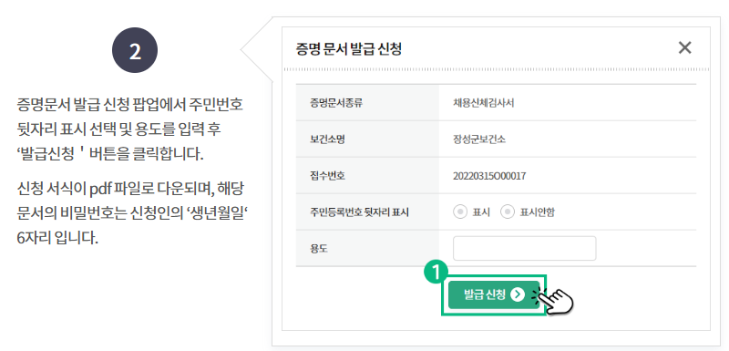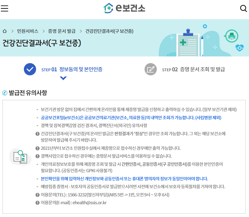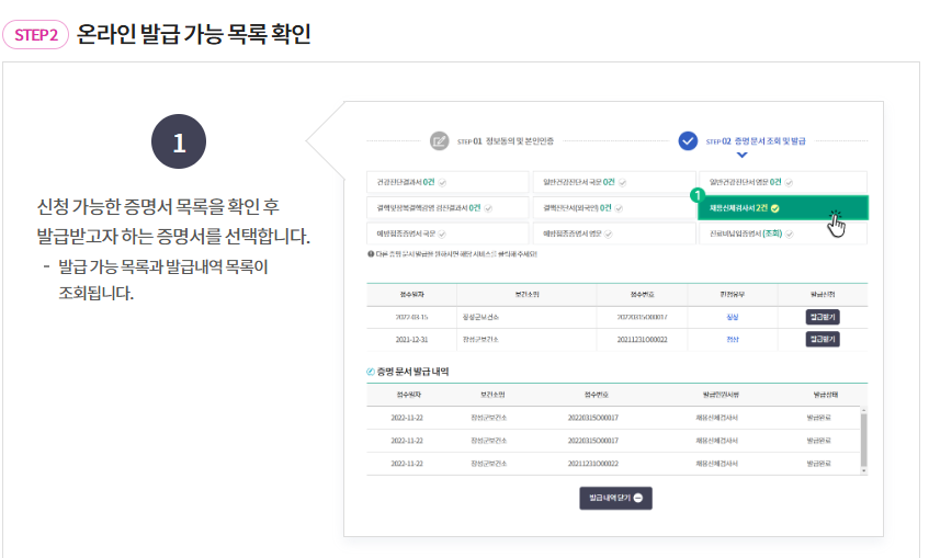 - 보건소에서 건강검진을 받은 경우에만 인터넷 발급이 가능합니다.