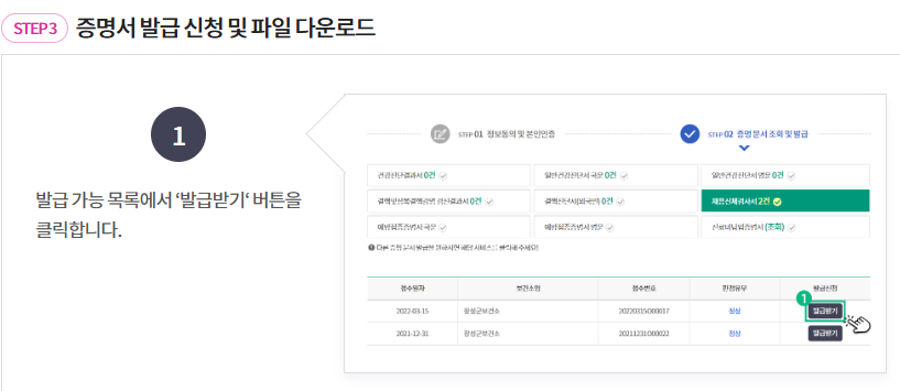- 결과가 확인되면 ‘신청하기’ 버튼을 눌러 발급을 진행합니다.