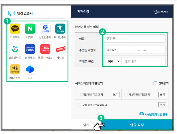 2. 인증기관 선택후, 이름, 주민번호, 휴대폰 번호를 입력 후 인증 요청하세요.