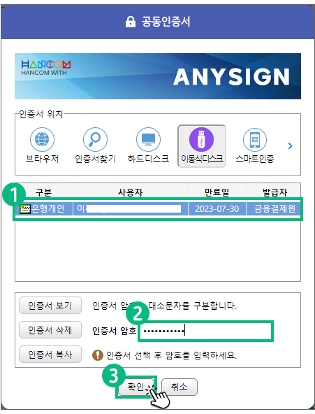 2. 인증서 선택화면에서 사용할 인증서를 선택하고 인증서 암호 입력 후 확인버튼을 클릭하여 다음단계로 이동합니다.