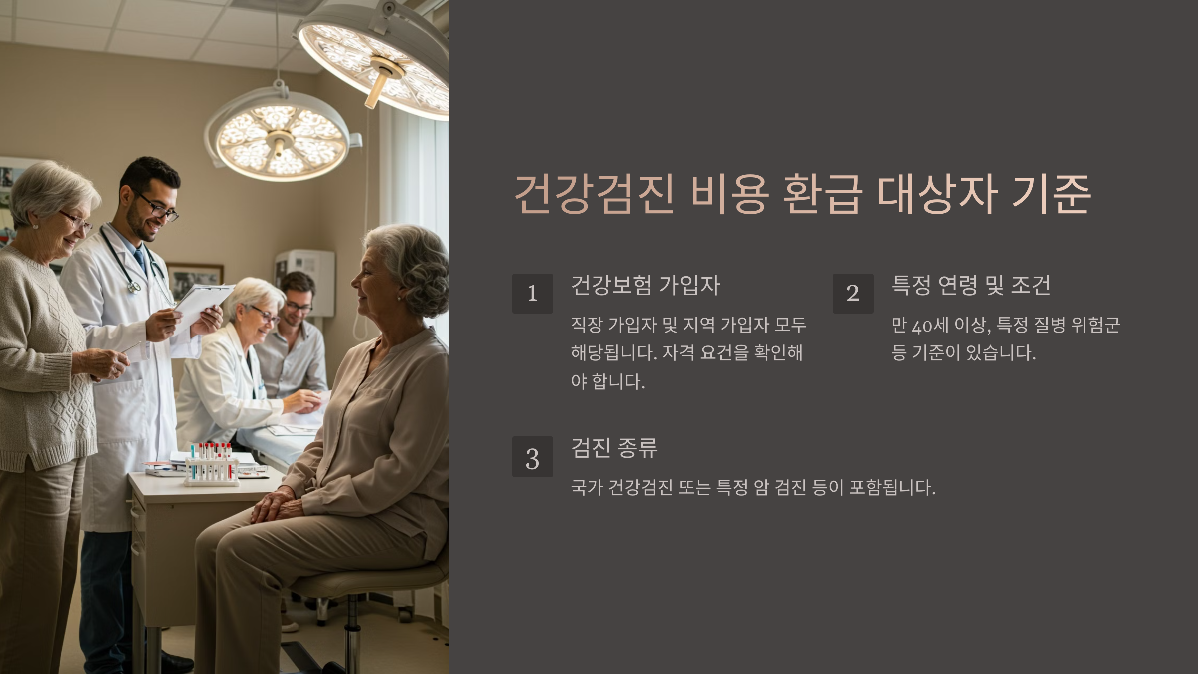 건강검진 비용을 환급받을 수 있는 대상은 크게 세 가지로 나뉘어요. 첫째, 국민건강보험 가입자로 정기 건강검진 대상자인 경우. 둘째, 직장인이며 회사에서 건강검진 비용을 지원하는 경우. 셋째, 개인적으로 건강검진을 받았지만 세액공제를 받을 수 있는 경우예요.