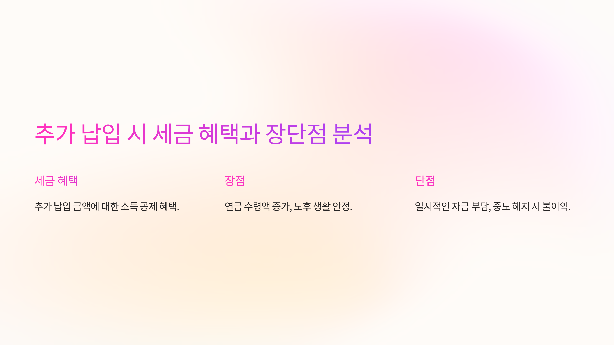 | 불필요한 추가 납입 | 가입 기간이 20년 이상이면 추가 납입이 연금 증가에 큰 영향을 주지 않을 수도 있음 |