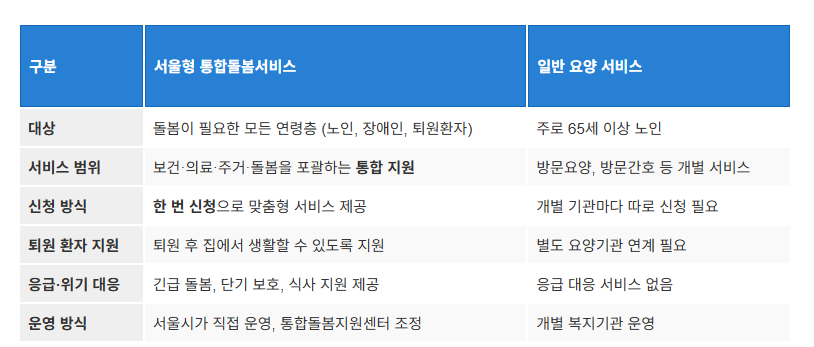 💡 서울형 통합돌봄서비스는 기존 요양 서비스보다 더 포괄적이고 체계적인 돌봄을 제공합니다!
