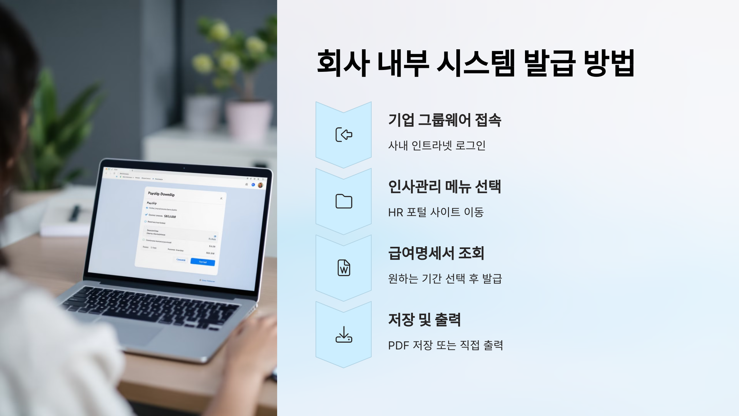 ERP(전사적 자원관리), HRM(인사관리 시스템) 또는 자체 구축된 내부 포털을 통해 근로자들은 언제든지 자신의 급여 내역을 조회하고 출력할 수 있습니다. 해당 시스템은 주로 사내 인트라넷을 기반으로 작동합니다.