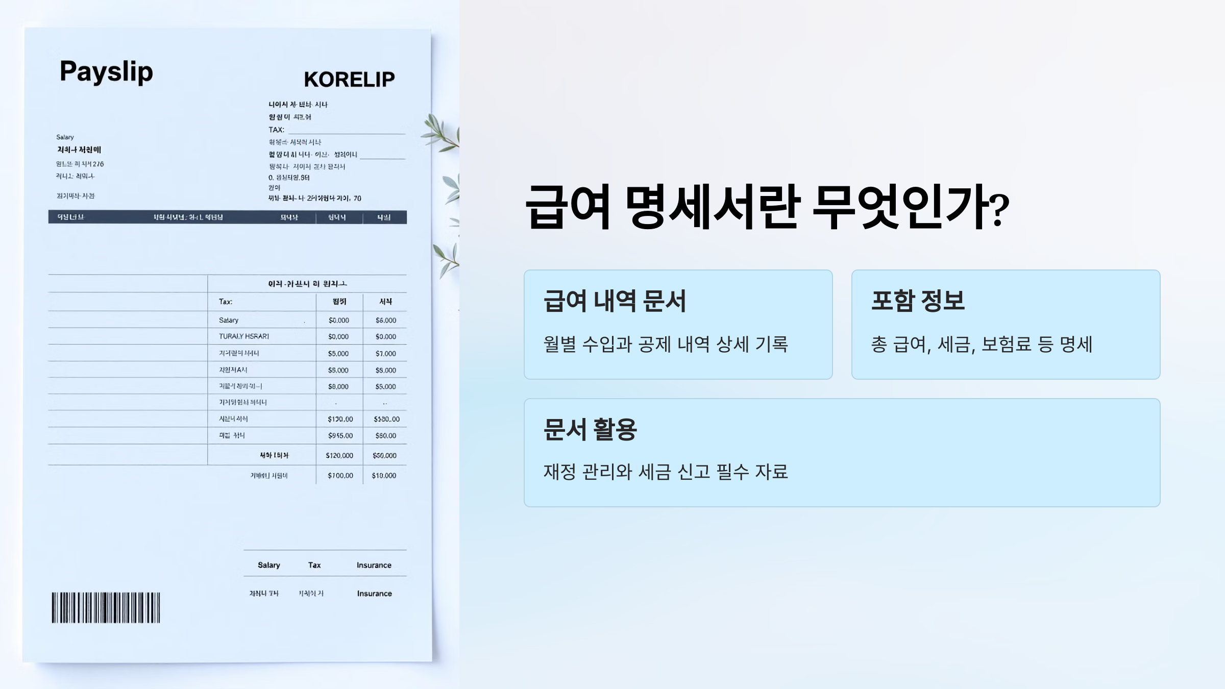 급여 명세서는 근로자가 자신이 받은 임금 내역을 확인할 수 있도록 고용주가 제공해야 하는 중요한 문서입니다. 세금, 사회보험, 실수령액 등을 한눈에 파악할 수 있어서 각종 금융 업무나 연말정산, 퇴사 시 정산에 꼭 필요한 서류이기도 합니다.