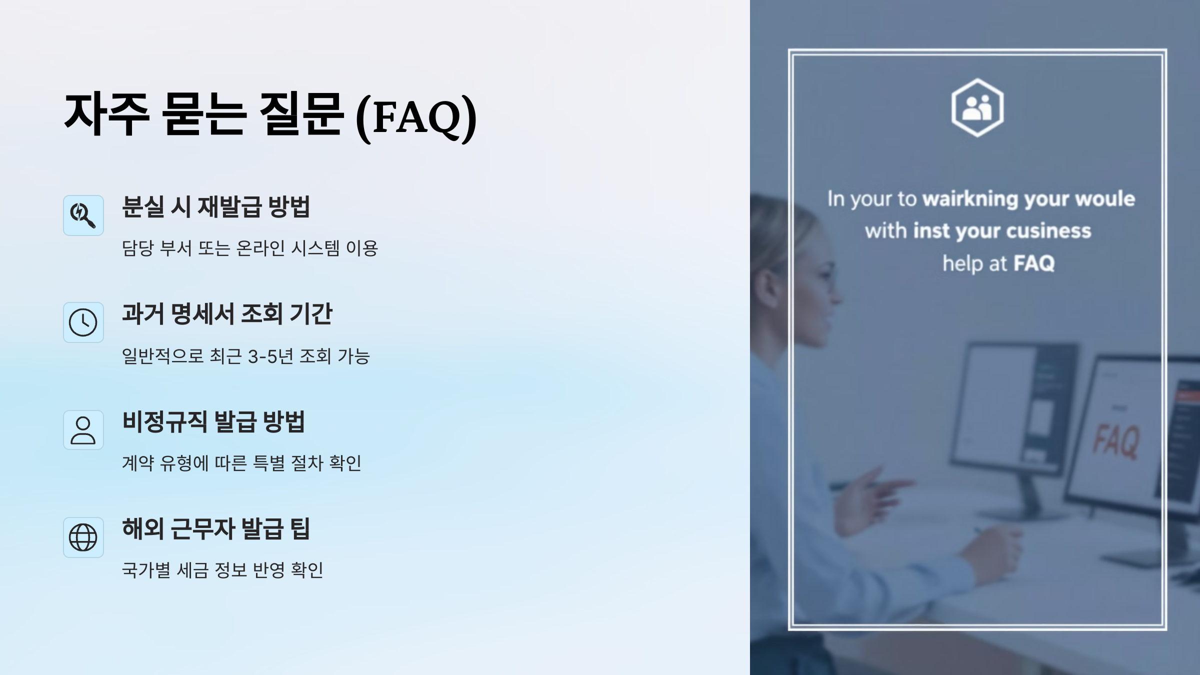 단, 퇴사자나 장기 휴직자의 경우 사내 시스템 접근이 제한될 수 있으므로 사전에 인사팀이나 총무팀에 요청해 이메일이나 팩스로 받아야 할 수도 있습니다. 이럴 땐 퇴사 전 미리 명세서를 백업해두는 것이 현명한 방법입니다.