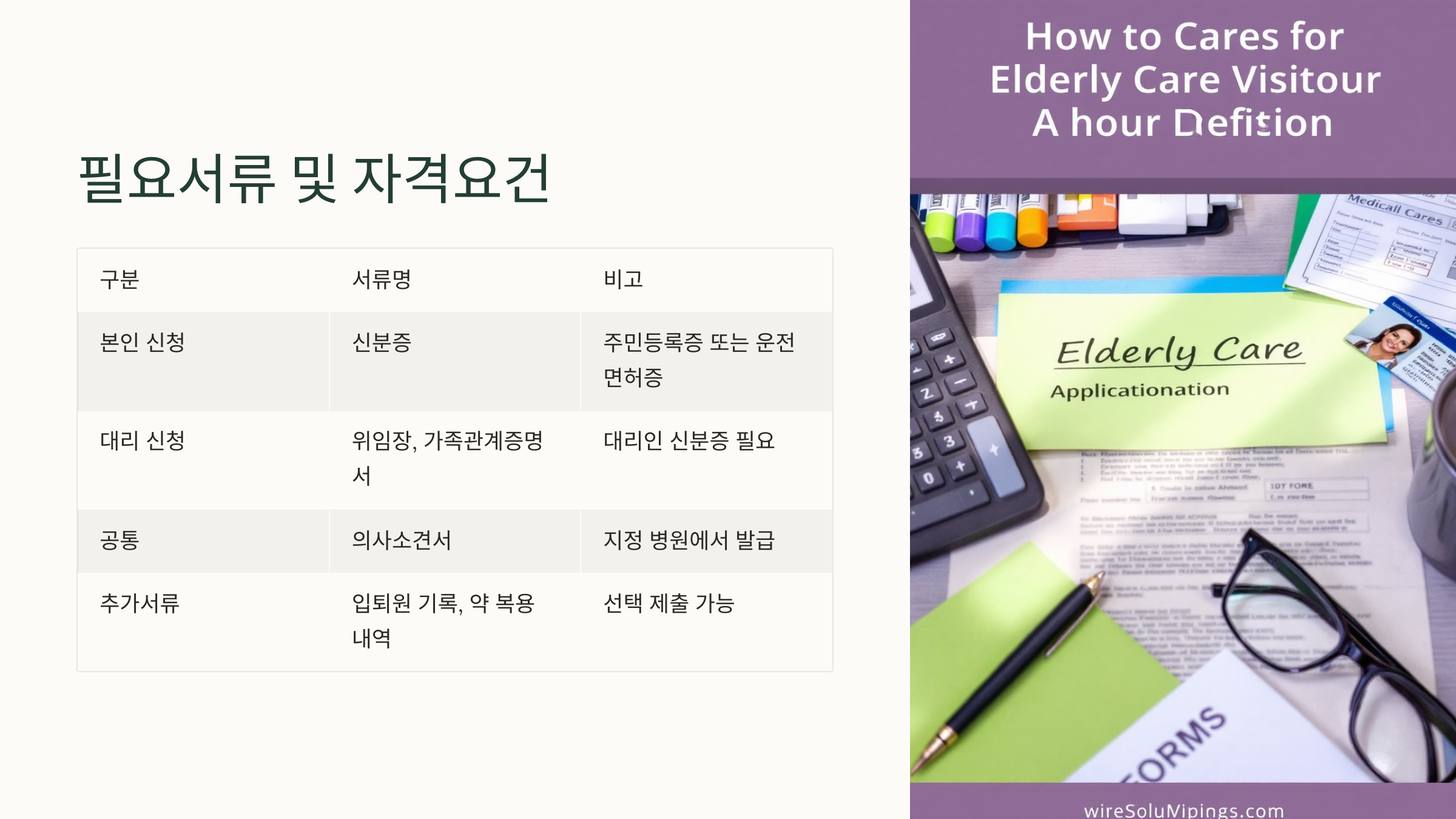 신청 시 기본적으로는 신청서, 본인 신분증, 가족의 경우 가족관계증명서와 위임장 등이 필요하고, 요양이 필요하다는 사실을 증명할 수 있는 병원 기록이나 진단서가 있으면 좋아요.