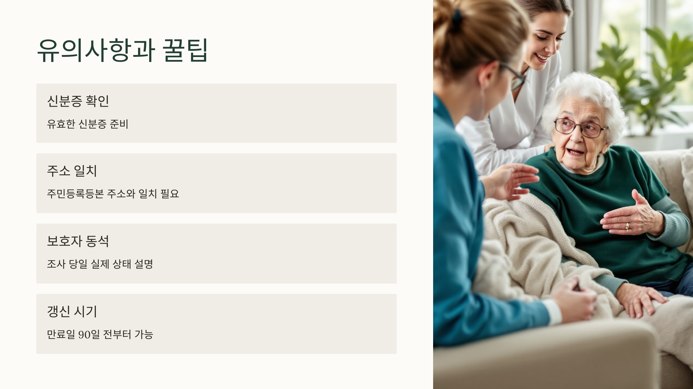 조사 당일에는 보호자가 함께 입회해서 환자의 실제 상태를 잘 설명하는 것이 중요해요. 일상생활이 어려운 점, 식사 도움 여부 등 구체적으로 전달해야 해요.