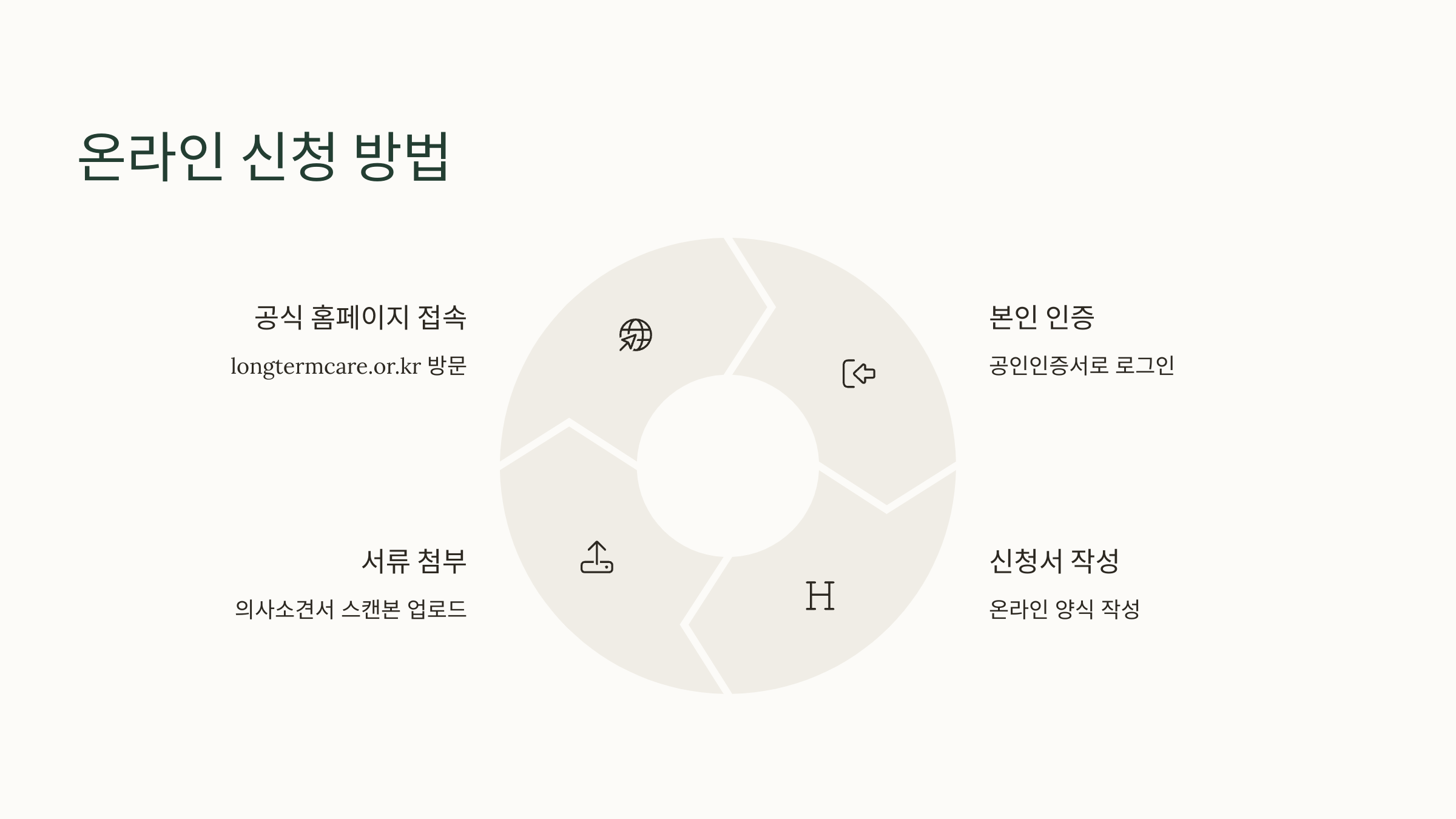국민건강보험공단 장기요양보험 웹사이트에서 '장기요양 인정 신청' 메뉴를 통해 본인인증 후 제출하면 됩니다.