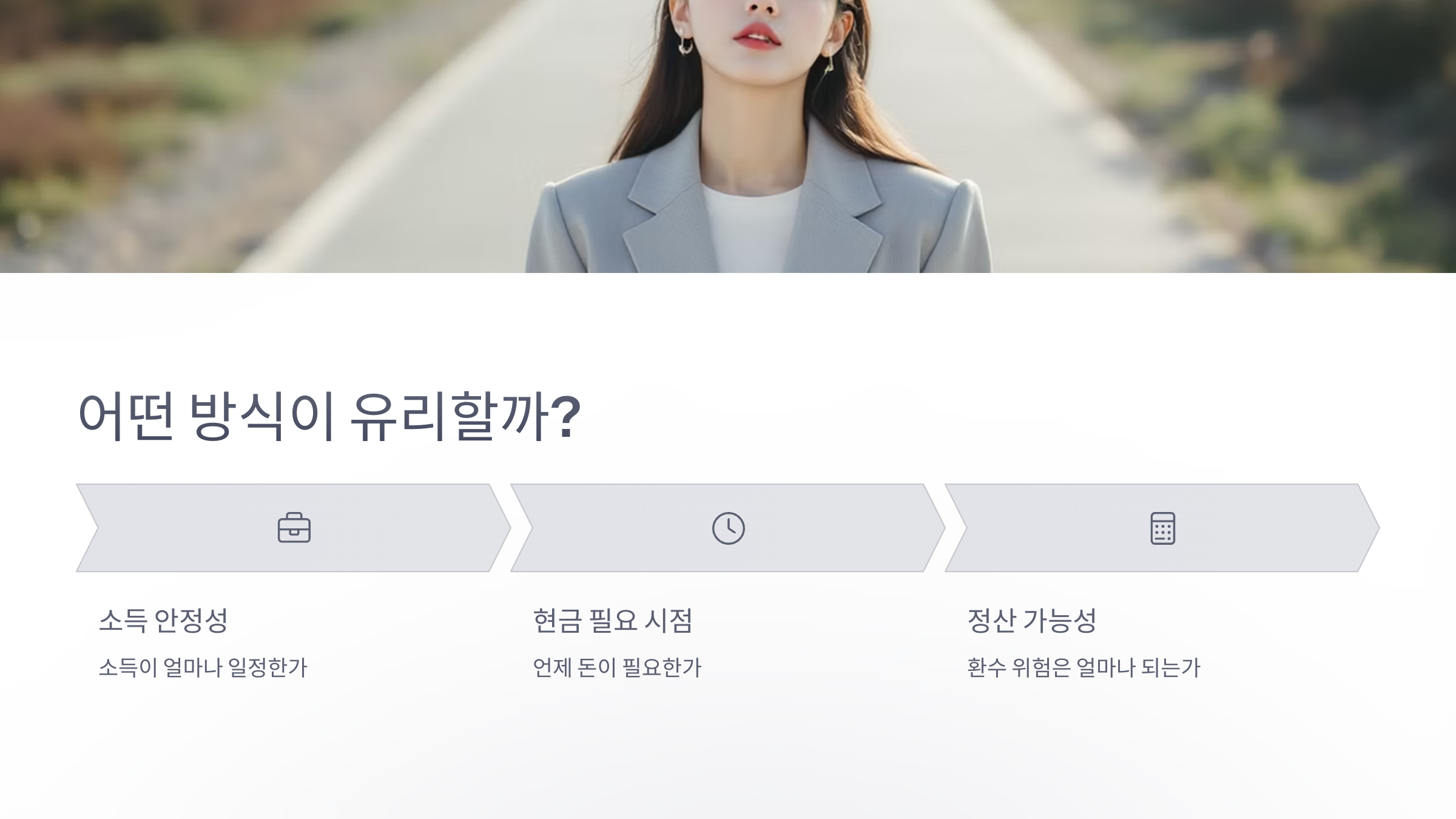 제 생각에 선택 기준은 “소득이 얼마나 안정적인가”와 “현금이 언제 필요한가” 입니다.