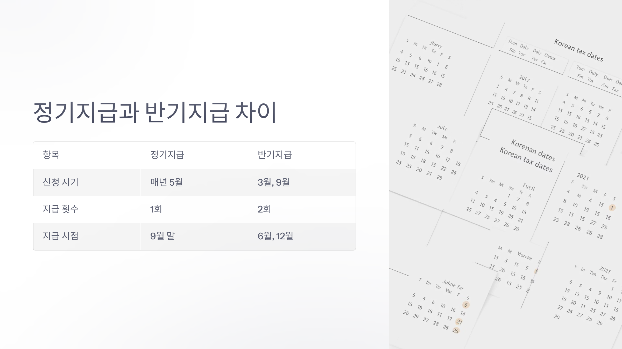 정기 지급은 매년 5월에 신청해서 9월경 한 번에 받는 방식이고, 반기 지급은 6개월 단위로 신청해 상·하반기 두 번 나눠 받는 방식이에요.