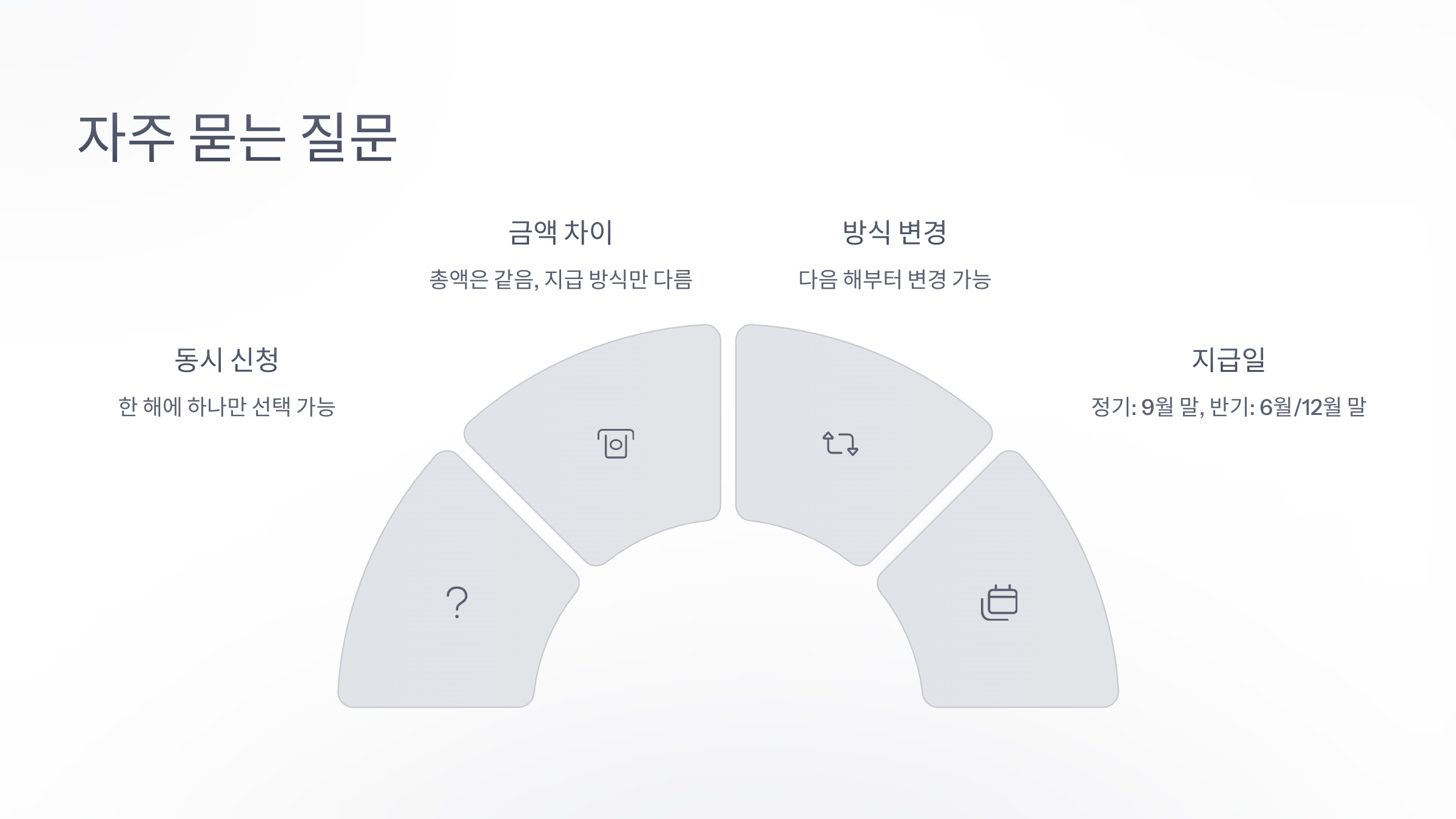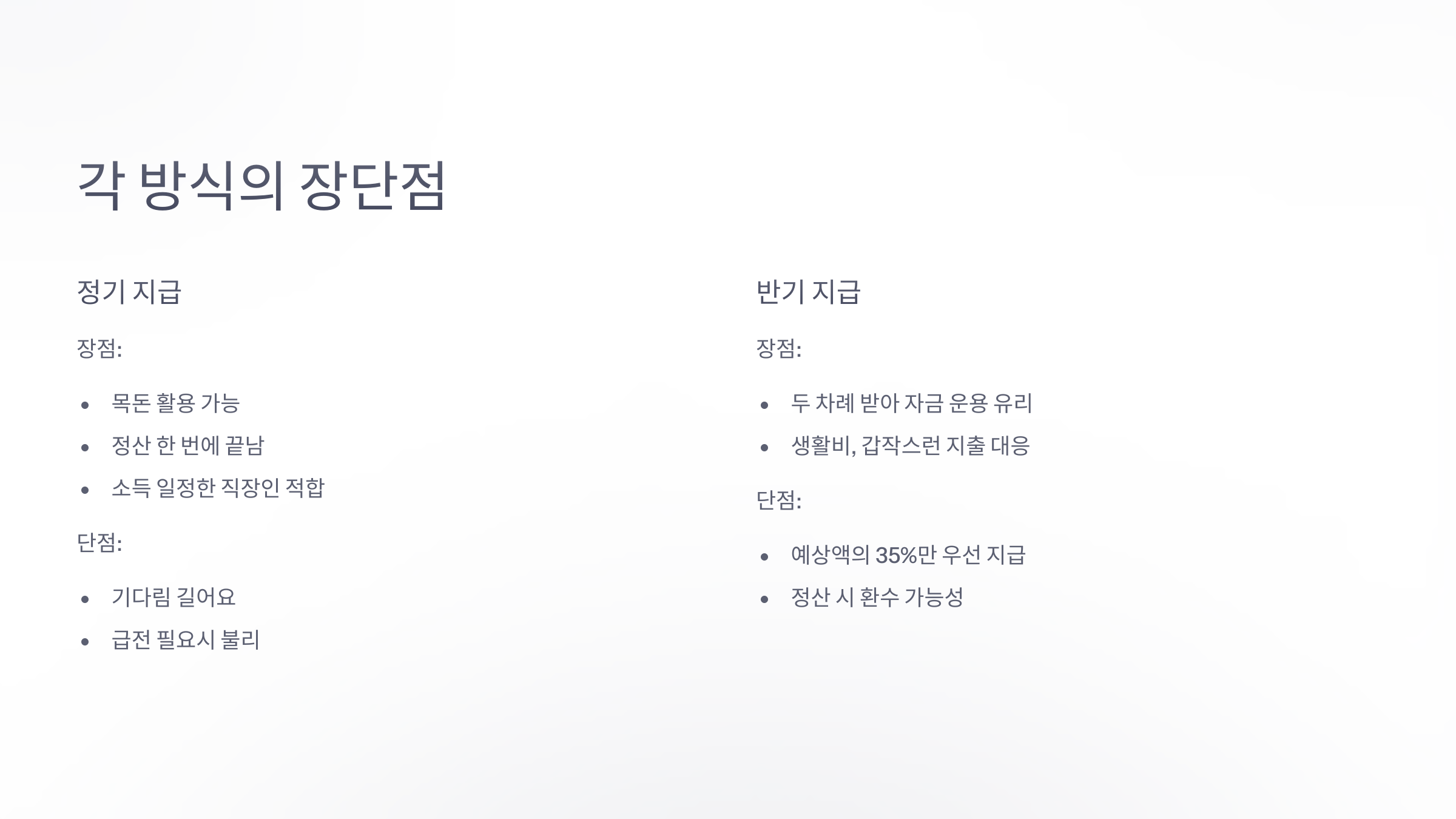 정기 지급과 반기 지급 모두 장단점이 명확해요. 어떤 방식이 ‘더 유리하다’기보단, 본인의 소득 구조와 자금 흐름에 따라 선택이 달라져요.