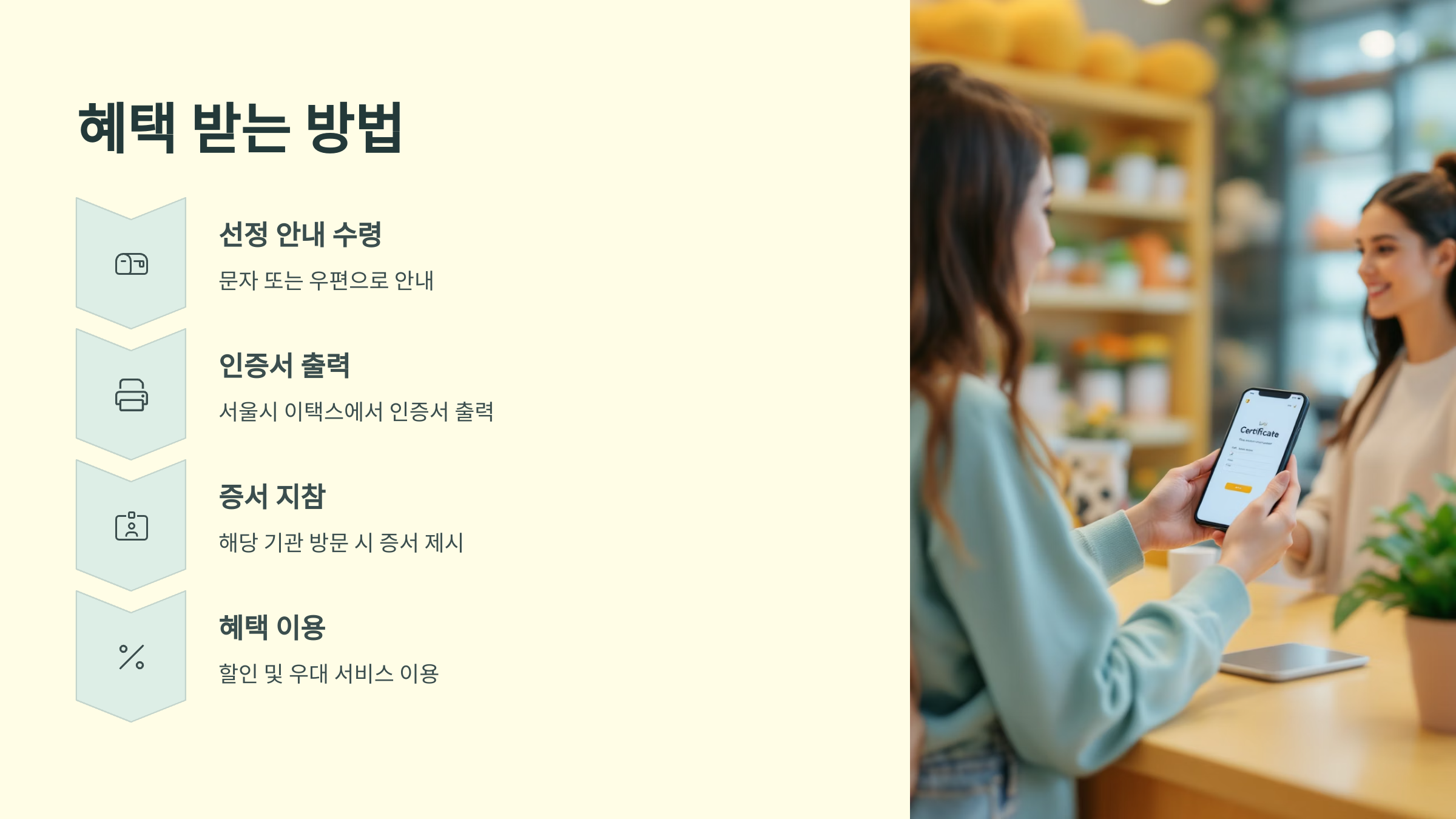 혜택을 받기 위해선 반드시 본인 확인이 필요해요. 온라인 출력된 인증서나 문자 안내 화면을 보여줘야만 우대가 적용돼요.
