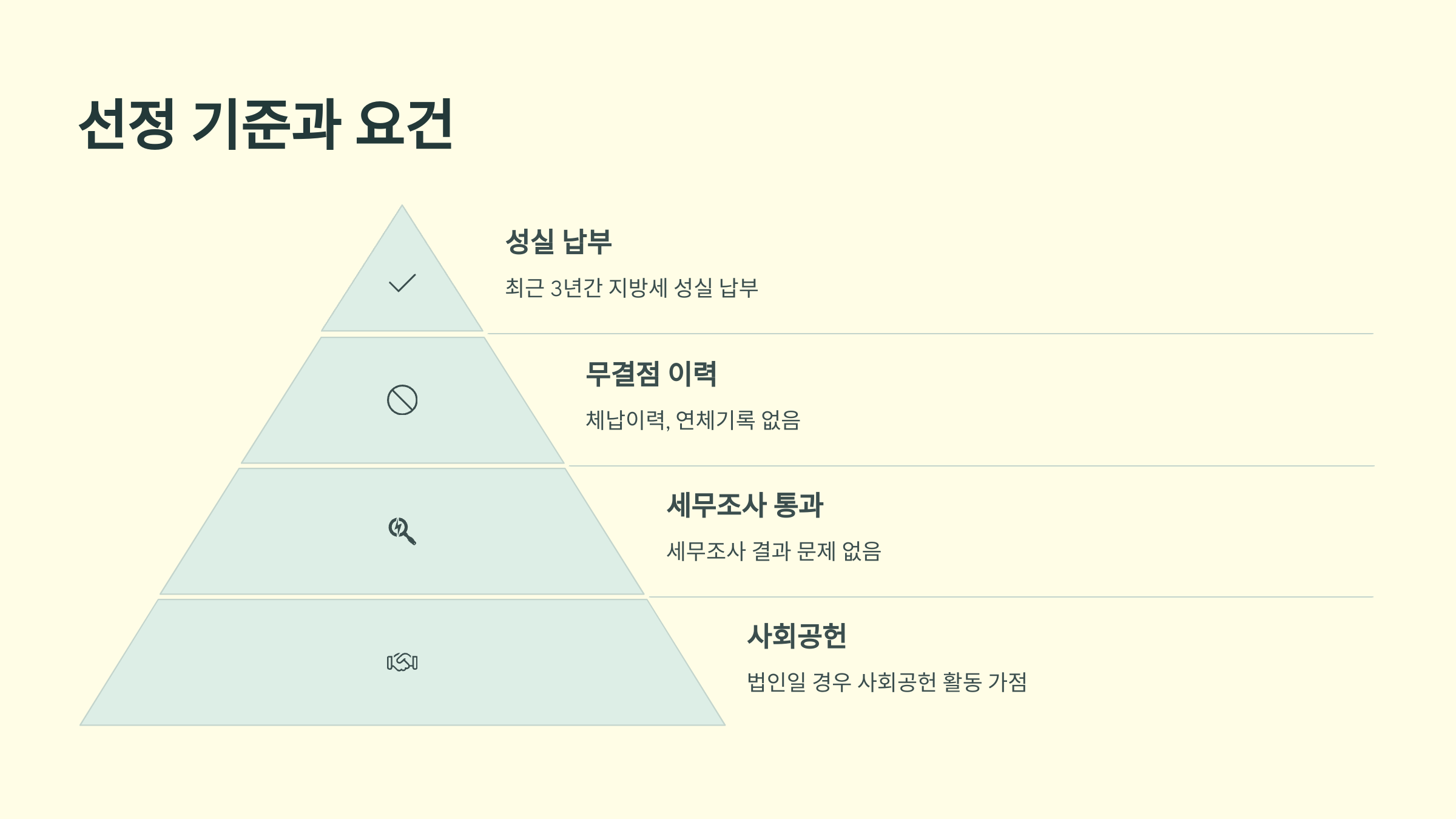 | 납부 실적 | 최근 3년 이상 성실 납세 | 세목 제한 없음 |