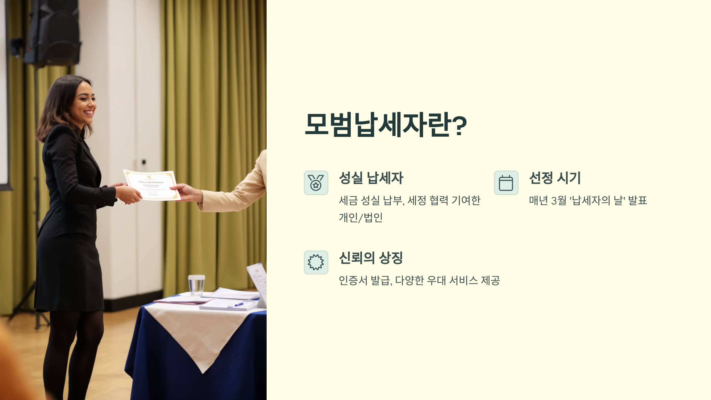 모범납세자로 선정되면 금융, 의료, 문화시설 등에서 다양한 할인 혜택을 받을 수 있고, 신용 평가나 각종 입찰, 대출 심사에서도 유리하게 작용할 수 있어요.