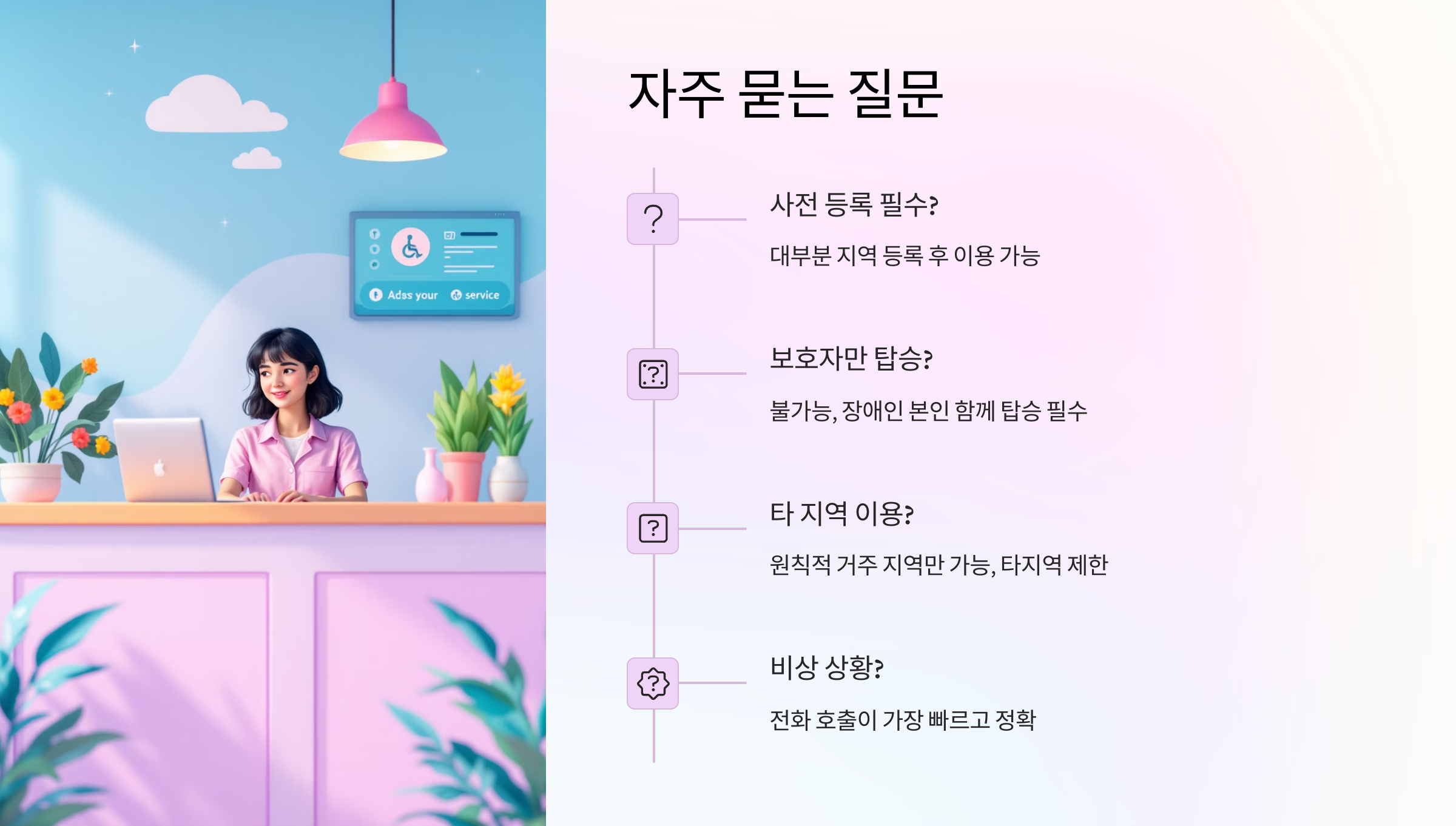 호출할 때는 출발지, 도착지, 탑승 인원, 휠체어 여부를 정확히 알려주는 게 중요해요. 그래야 최적의 차량이 배정된답니다!