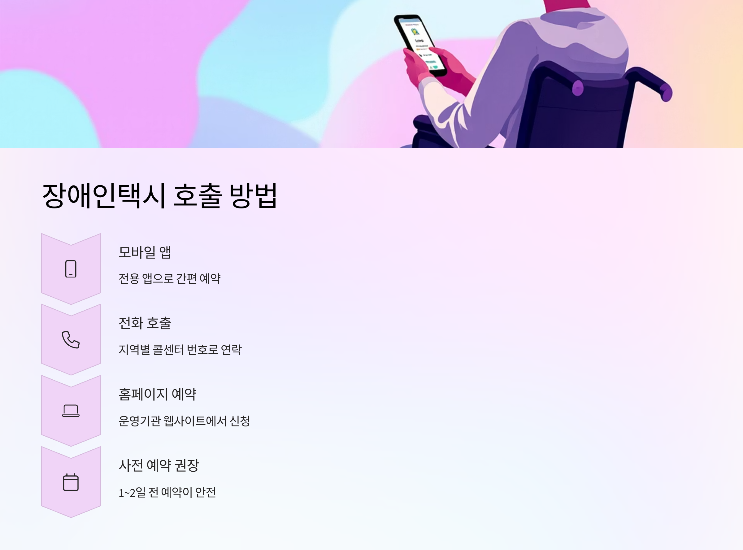 | 모바일 앱 | 전용 앱 다운로드 후 예약·호출 (예: 서울장애인콜택시 앱) |