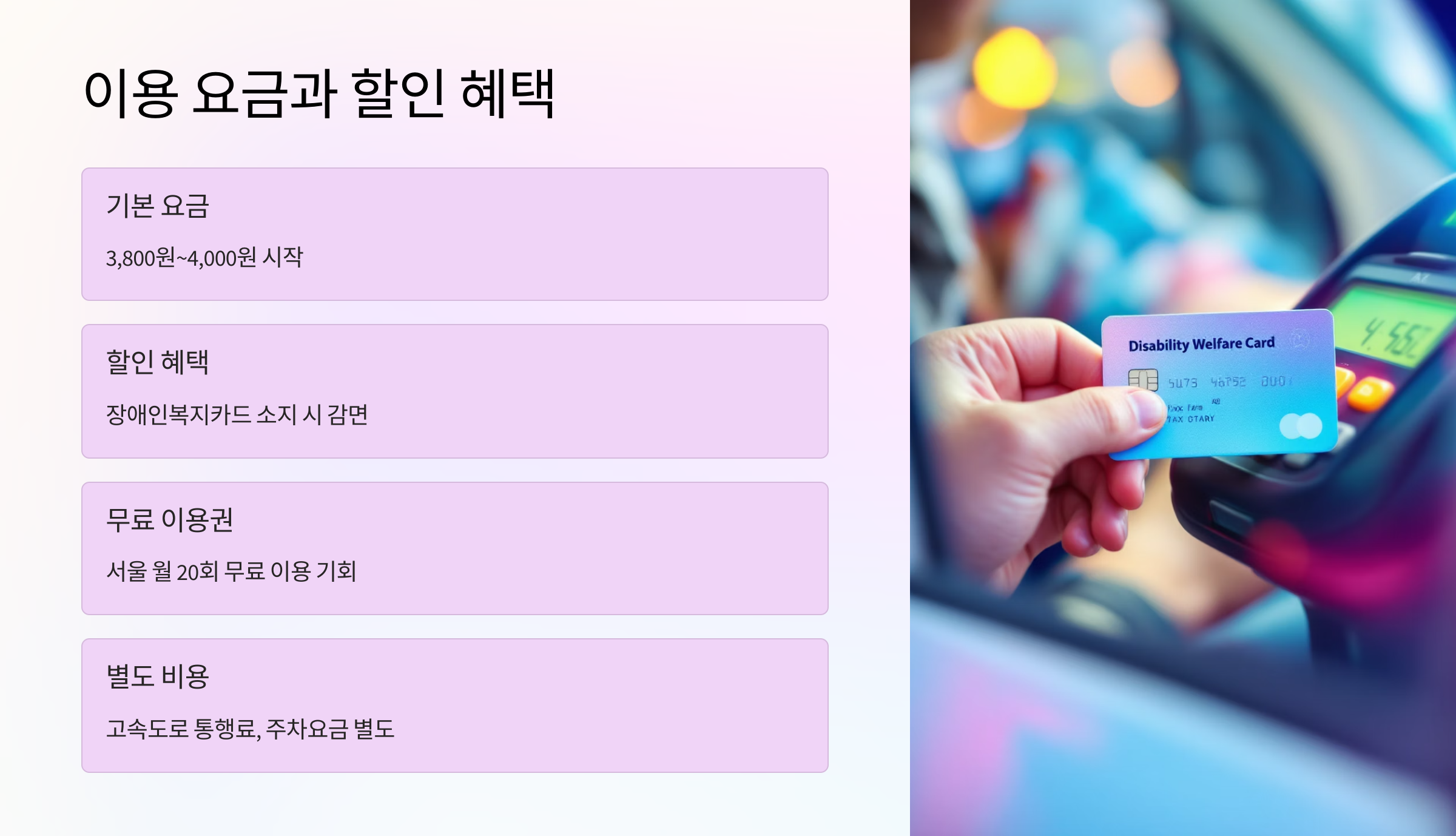 | 할인 혜택 | 장애인복지카드 소지 시 요금 감면 |