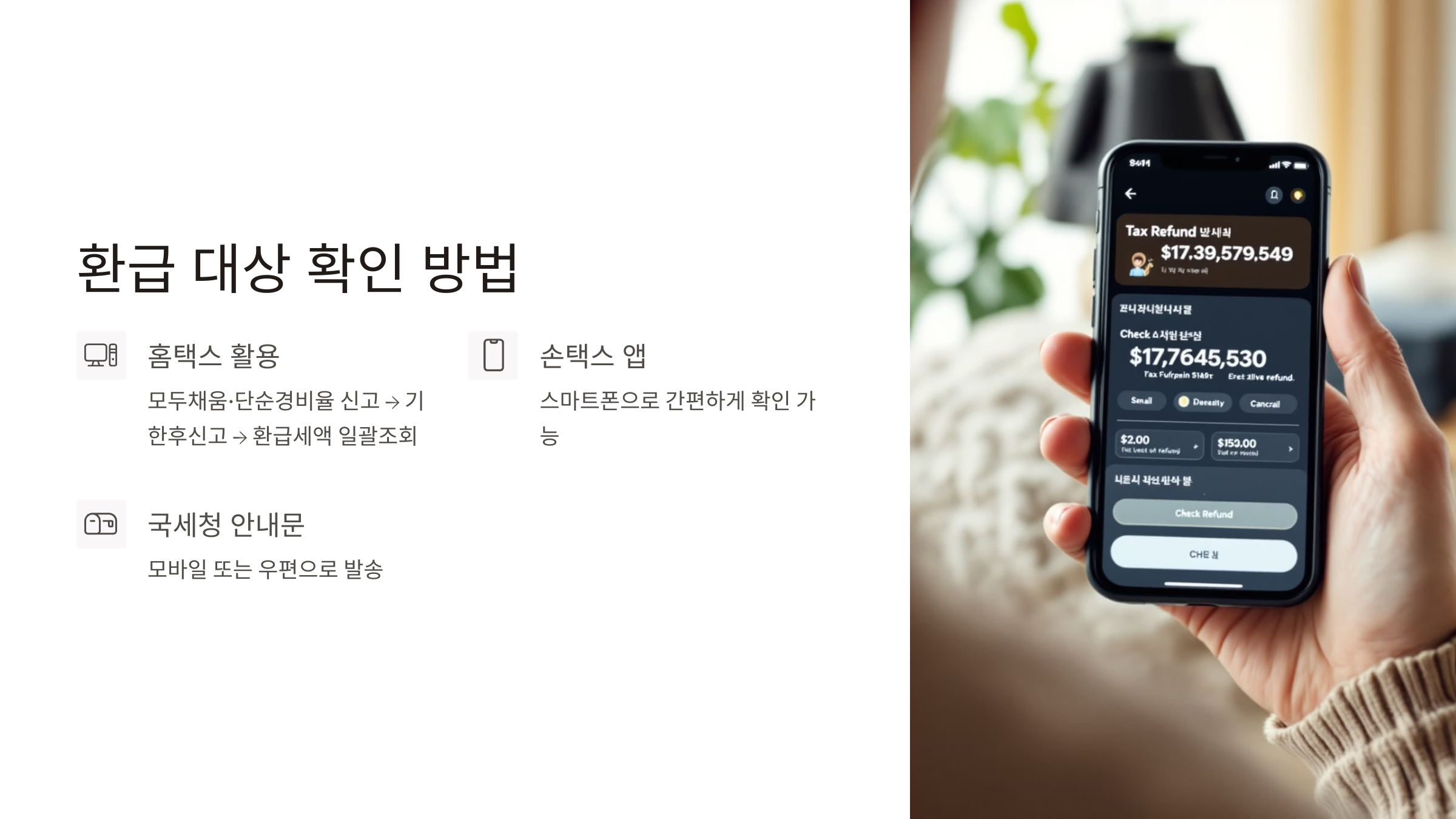 - 국세청 안내문 확인: 환급 대상자라면 국세청에서 모바일 또는 우편으로 안내문을 발송합니다. 혹시 놓쳤더라도 걱정 마세요! 위에서 설명드린 홈택스/손택스를 통해 직접 확인할 수 있습니다.
