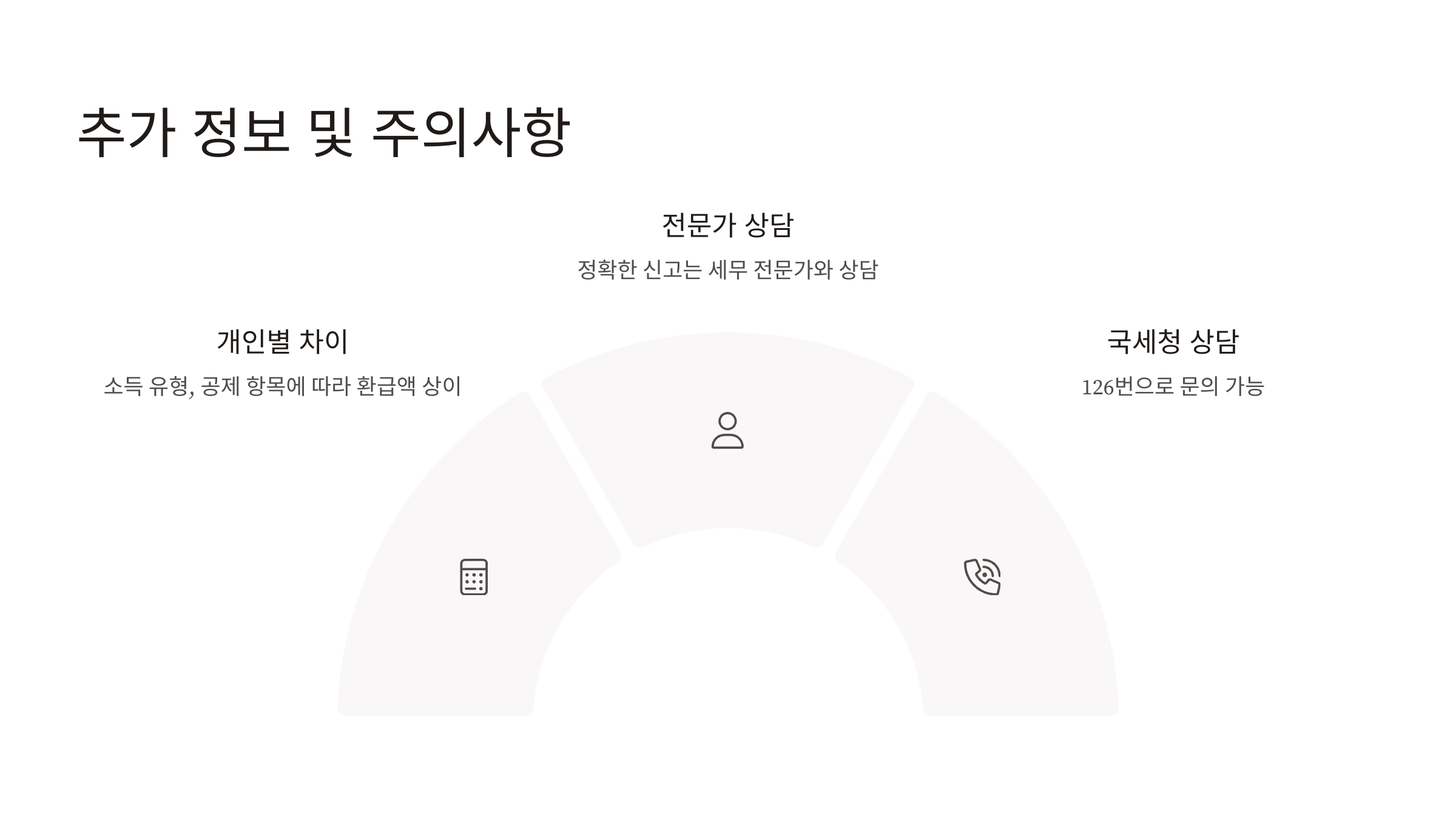 - 소득 유형, 공제 항목 등 개별적인 상황에 따라 환급액이 달라질 수 있습니다.