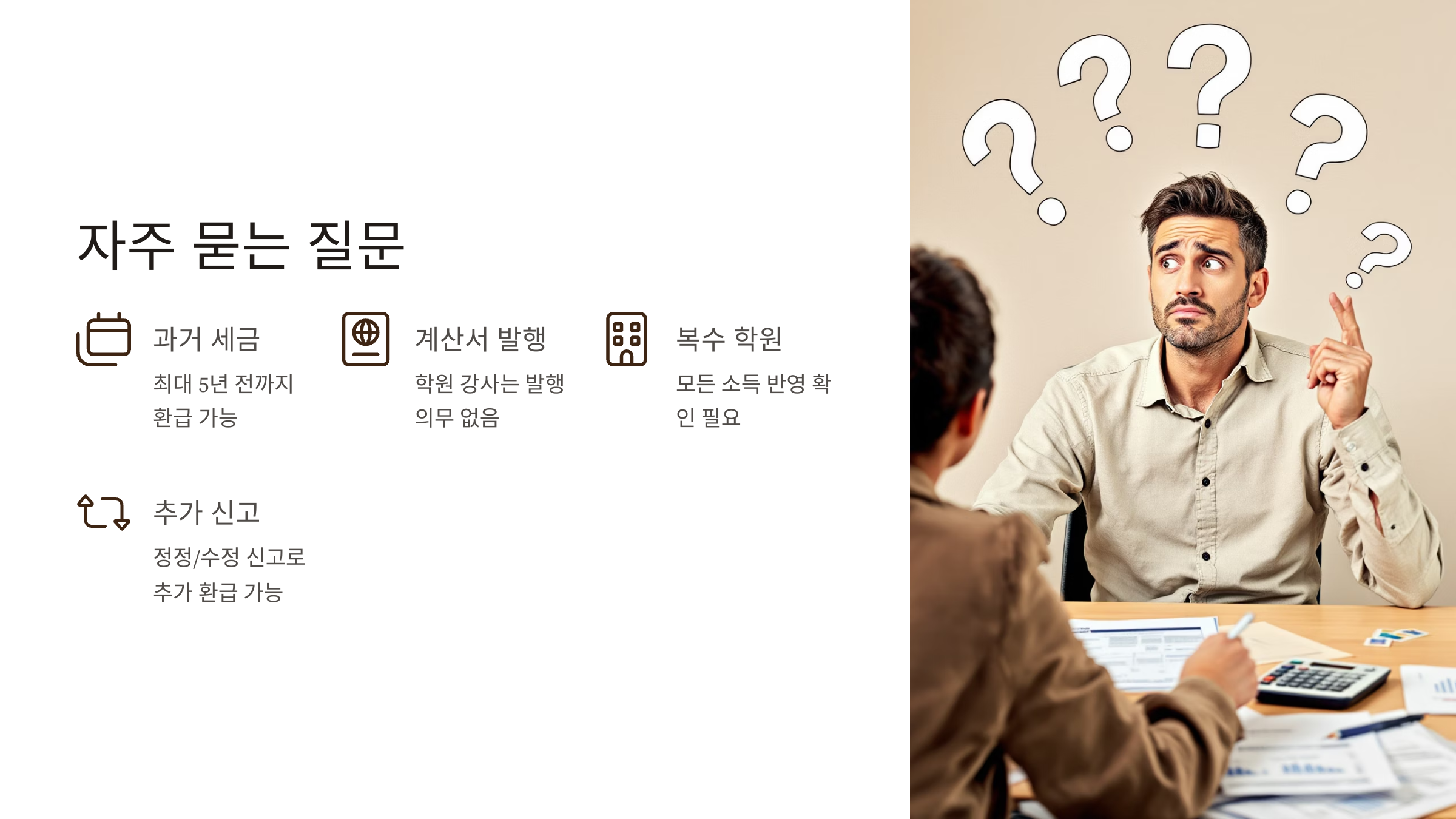 학원 강사 여러분, 힘들게 일한 만큼 정당한 대가를 받는 것은 당연한 권리입니다. 혹시 세금 환급 대상인데도 모르고 넘어가고 있지는 않으신가요?