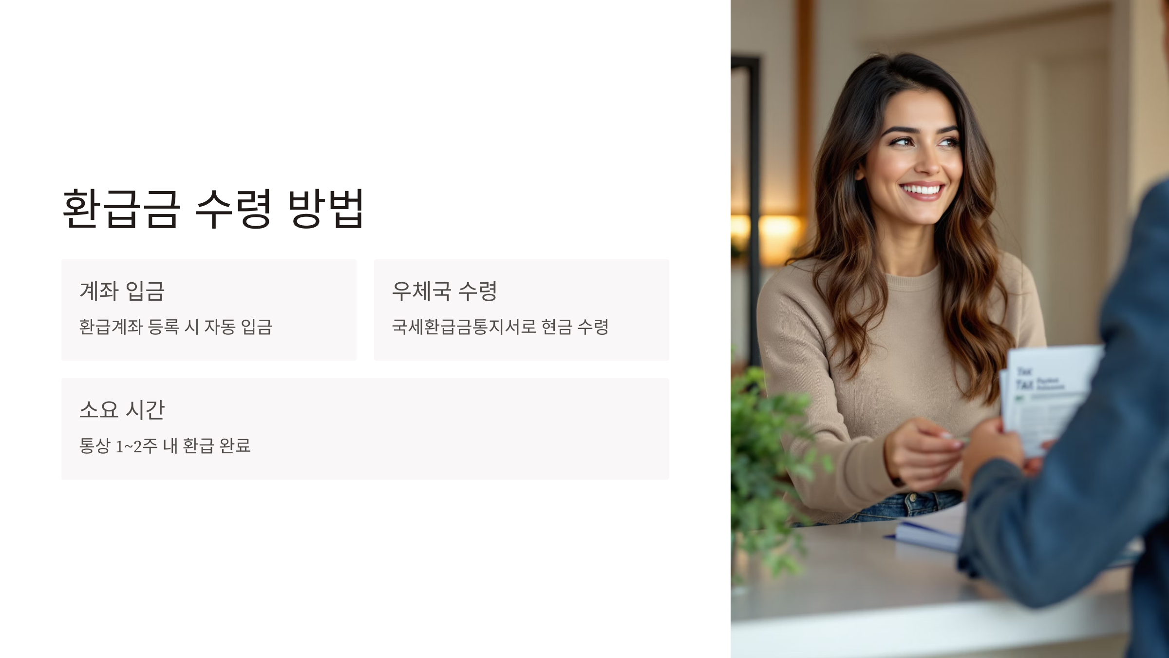환급 신고를 완료했다면, 이제 환급금을 수령할 차례입니다. 환급계좌를 등록했다면 등록된 계좌로 입금됩니다. 만약 환급계좌를 등록하지 않았다면 '국세환급금통지서'를 통해 우체국에서 현금으로 수령할 수 있습니다.