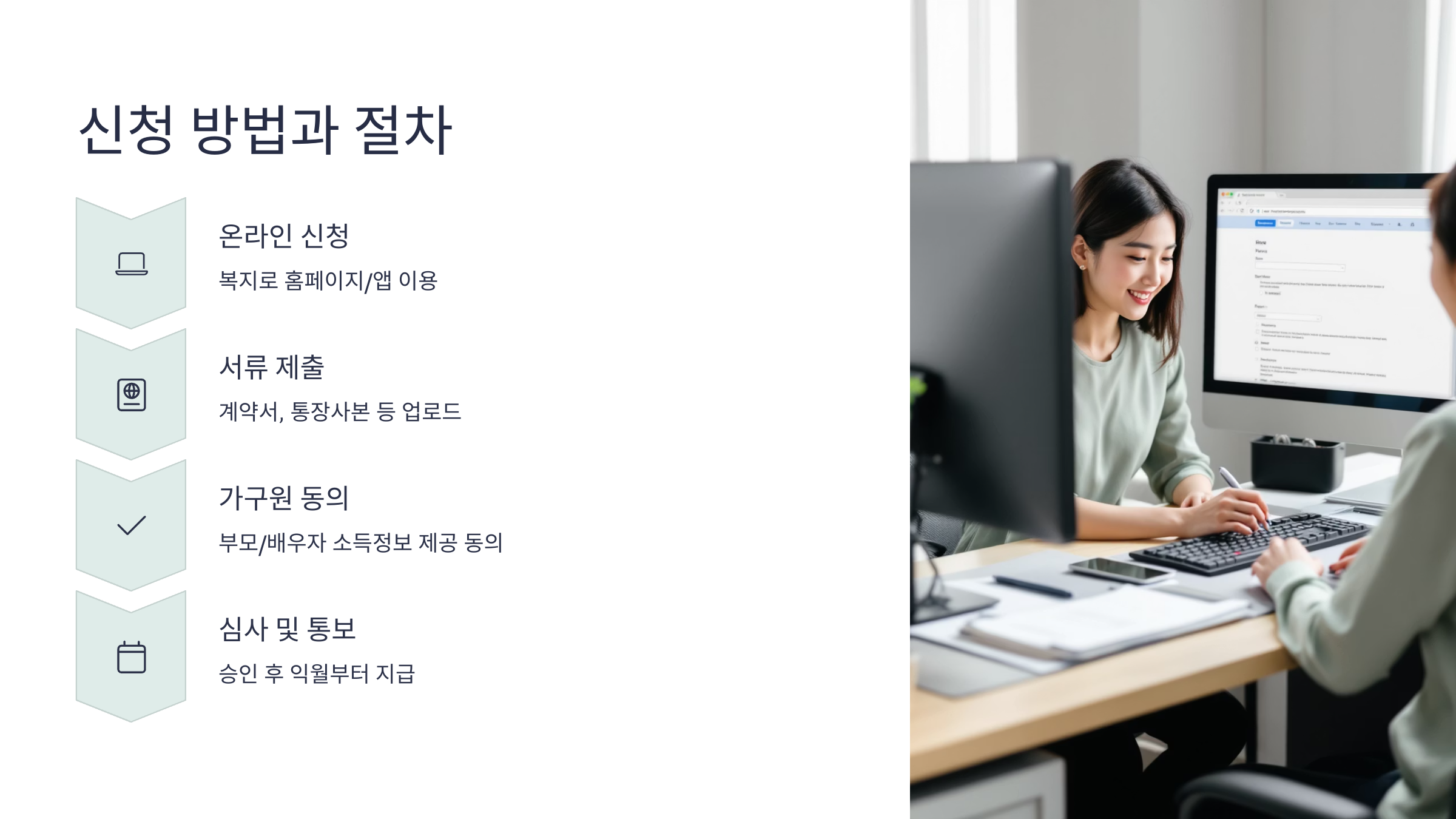 신청은 100% 온라인으로 이루어지며, 복지로 홈페이지 또는 모바일 앱을 통해 진행합니다.