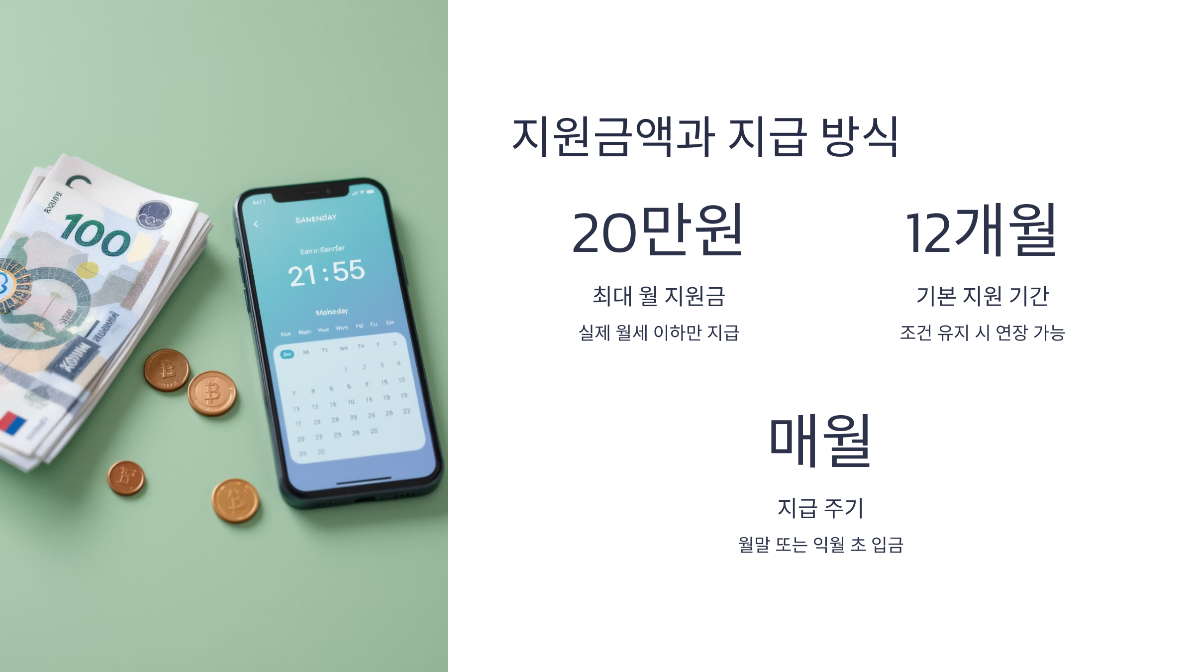 지원 금액은 월 최대 20만원이며, 매월 말일이나 익월 초에 신청자의 계좌로 현금 지급됩니다.