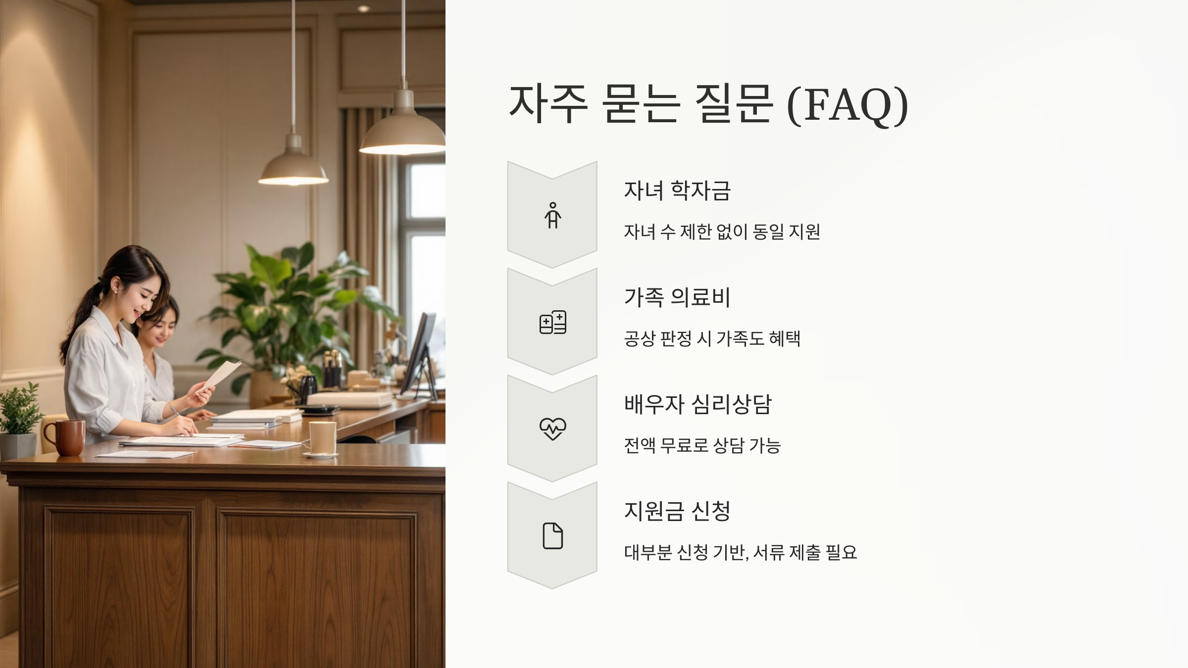 공상 판정을 받은 경우에는 가족도 의료비와 상담비 혜택을 받을 수 있고, 자녀의 장학금 범위도 크게 확대돼요. 이처럼 ‘누가 받을 수 있냐’에 대한 기준은 상황에 따라 다르기 때문에 본인의 근무지 소방서나 복지부서에 확인하는 게 가장 정확해요.