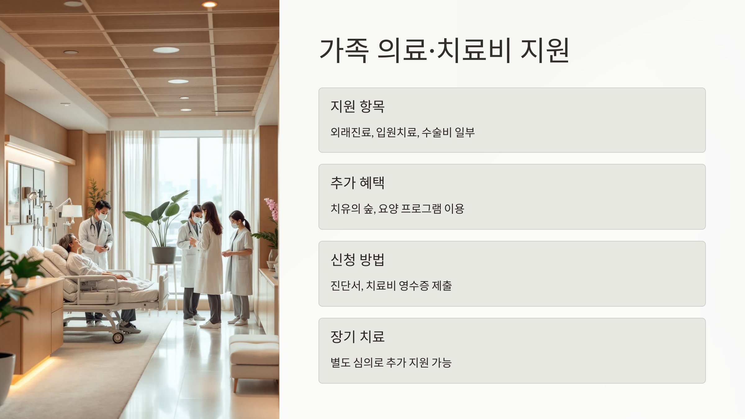 가족의 병원비는 생각보다 부담이 클 수 있어요. 그래서 소방공무원이 공상 판정을 받은 경우에는 배우자와 자녀도 일부 의료비 지원을 받을 수 있어요. 진단서, 치료비 영수증 등 제출이 필요하죠.