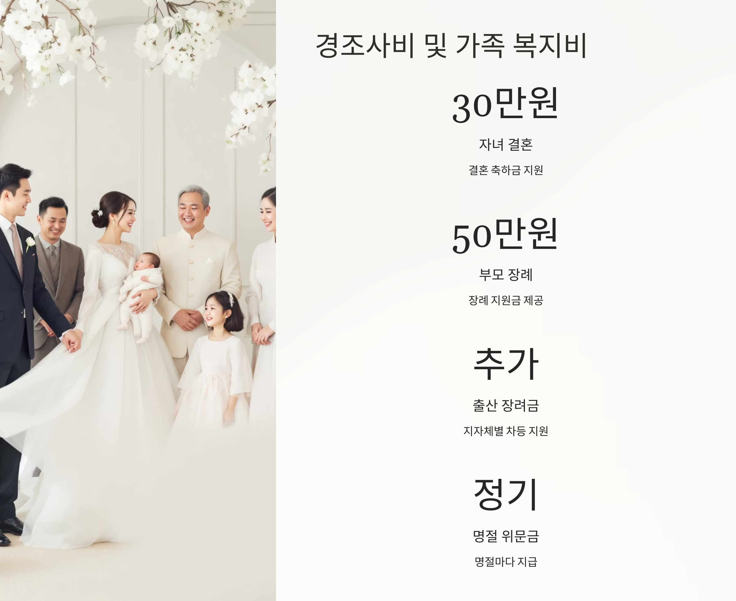 예를 들어 자녀 결혼 시 30만원, 본인 부모 장례 시 50만원까지 지급되는 경우가 많아요. 일부 지자체에서는 출산 장려금을 별도로 추가 지원하기도 하죠.