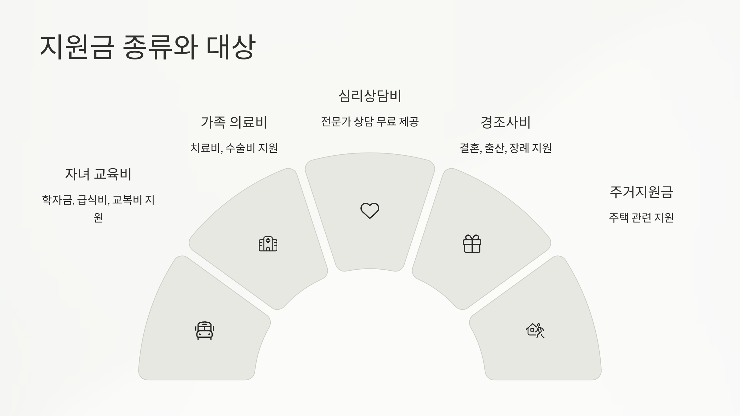 가족 지원금은 크게 5가지로 나뉘어요. 자녀 교육비, 가족 의료비, 심리상담비, 경조사비, 주거지원금이 대표적이에요. 이 외에도 명절 위문금, 가족캠프, 문화 프로그램 참가비 등 간접적인 지원도 포함돼요.