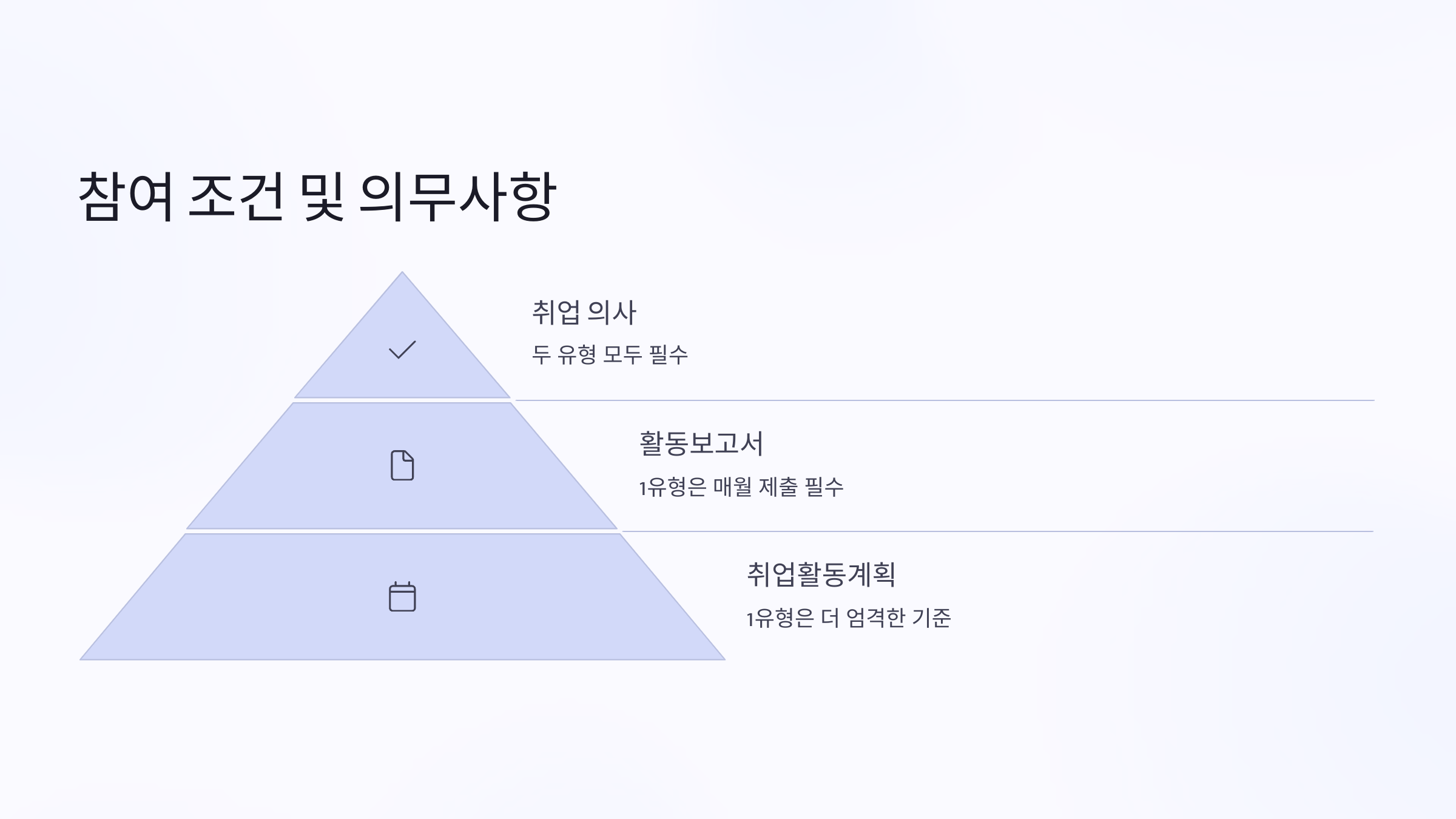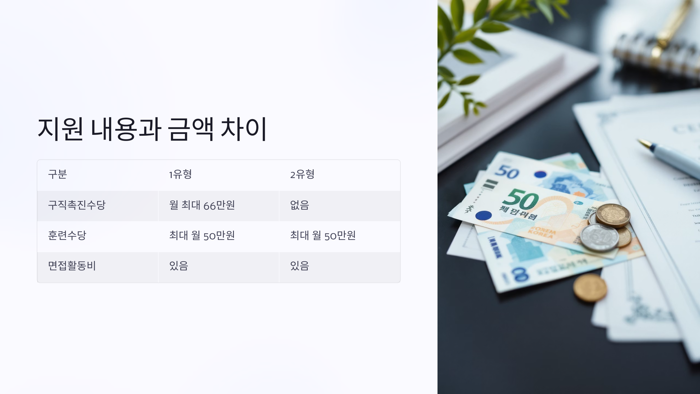 1유형은 생계 지원이 포함된 ‘실업부조’ 성격이고, 2유형은 취업 준비에 중점을 둔 ‘취업지원 서비스형’이에요. 두 유형 모두 공통적으로 상담, 직업훈련, 일경험 제공이 포함되지만, 수당과 자격 기준에서 큰 차이가 있어요.