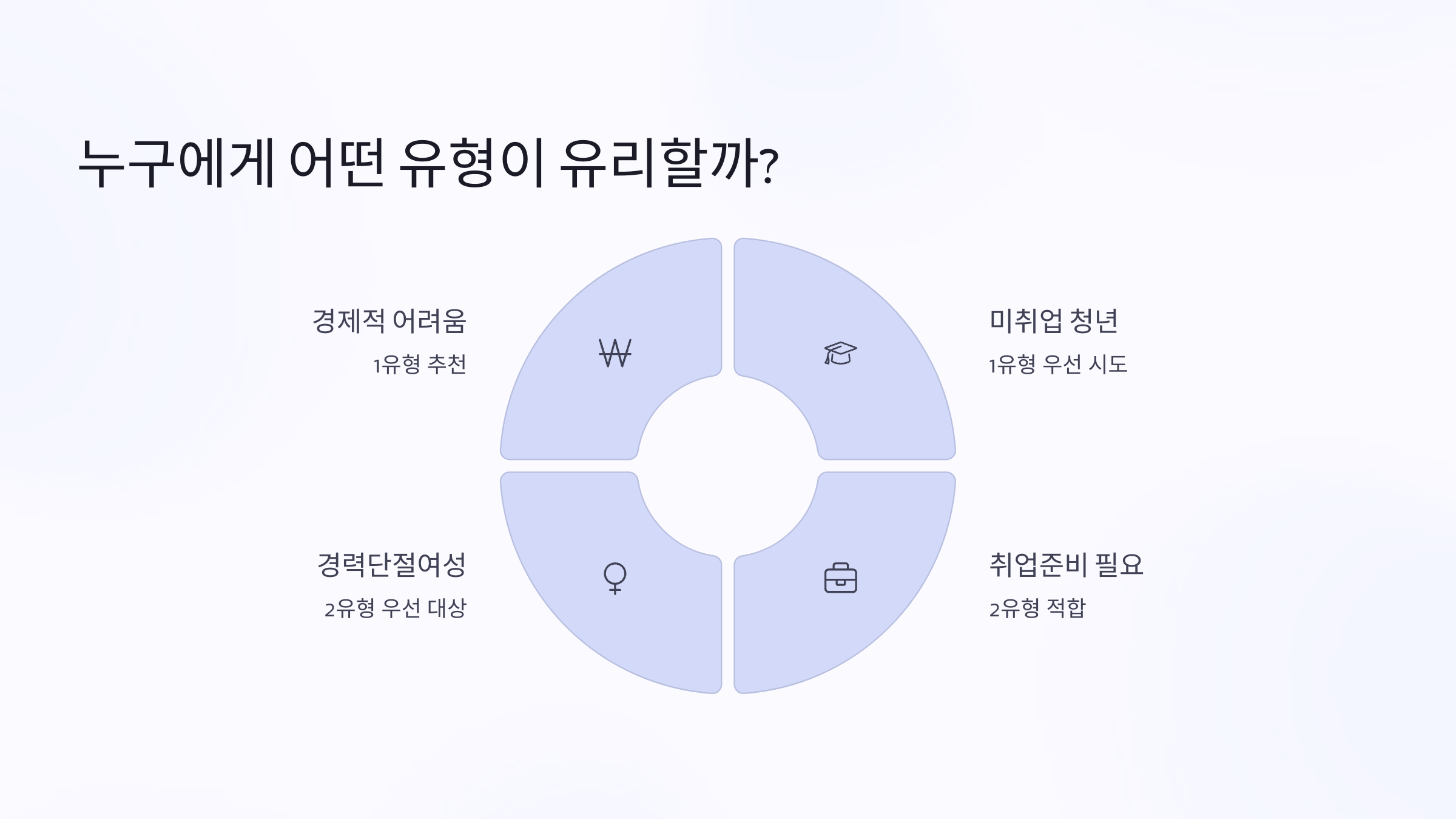 경제적 어려움이 크고, 당장 생계에 도움이 필요한 경우라면 1유형이 훨씬 유리해요. 매달 수당을 받을 수 있고, 직업훈련도 병행할 수 있어요.