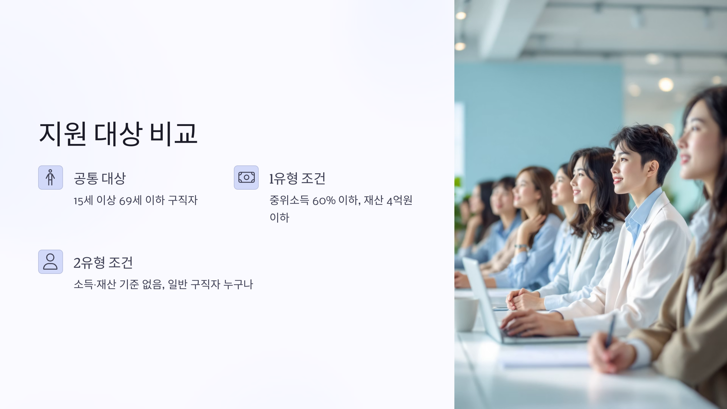 1유형과 2유형은 기본적으로 모두 15세 이상 69세 이하 구직자가 신청할 수 있어요. 하지만 대상 기준에 분명한 차이가 있답니다.