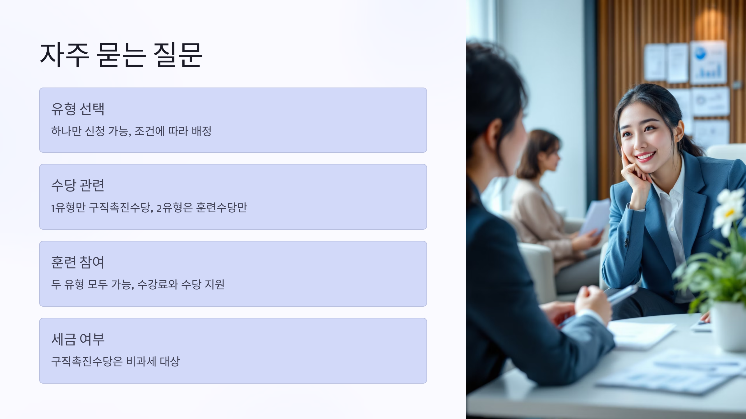 양쪽 모두 상담, 일경험, 직업훈련, 알선 등 취업서비스는 동일하게 제공되며, 서비스의 질도 큰 차이는 없어요. 단, 1유형은 ‘수당’이 있고 2유형은 ‘서비스 중심’이라는 점이 핵심이에요.