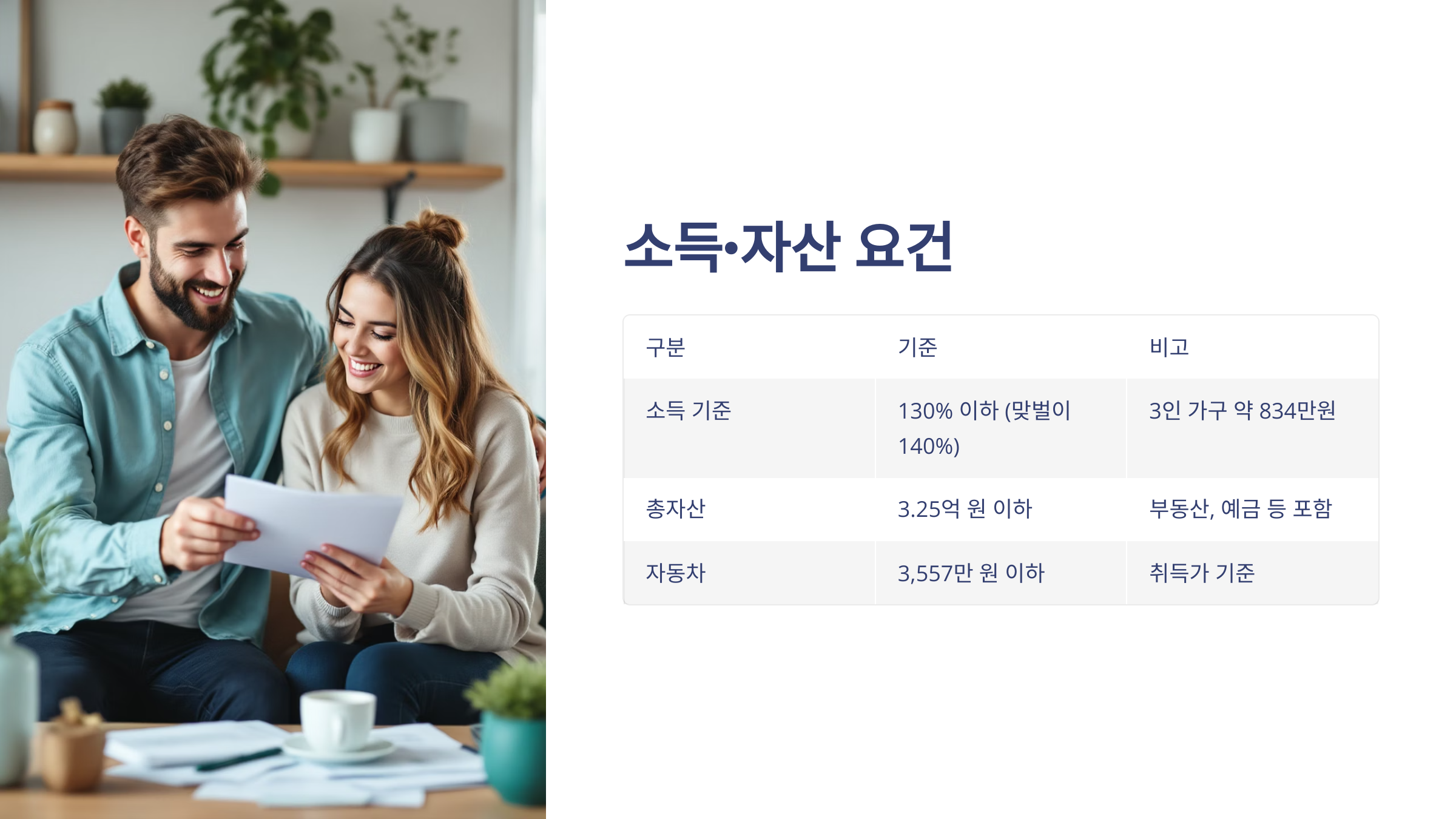 소득 기준은 도시근로자 월평균 소득의 130% 이하(맞벌이 140% 이하)예요. 예를 들어 3인 가구 기준 약 834만원 정도예요. 자산 기준은 총자산 3.25억 원 이하, 자동차는 3557만 원 이하예요.