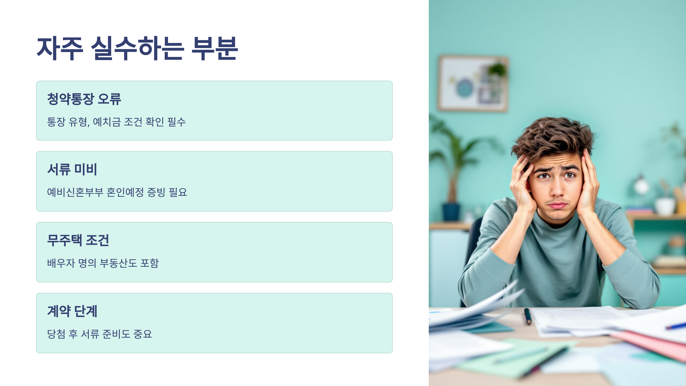 가장 흔한 실수는 청약통장 유형이나 예치금 조건을 잘못 알고 접수하는 경우예요. 본인 명의 통장의 가입기간과 예치금이 충분한지 꼭 사전에 확인해야 해요.