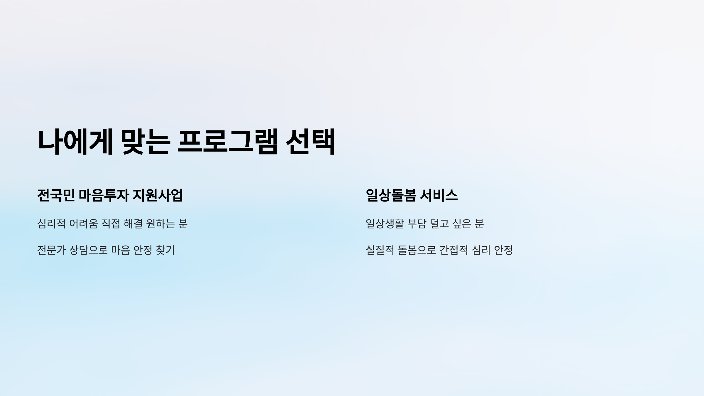 A6. 직접적인 심리상담이 필요하면 '마음투자 지원사업', 생활 속 도움과 간접적인 심리안정이 필요하면 '일상돌봄 서비스'를 추천해요. 나에게 더 필요한 지원을 골라보세요!