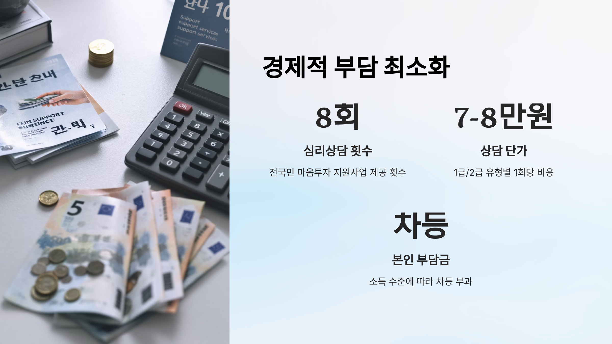 A2. 전문 심리상담 서비스를 총 8회 제공해요. 1급, 2급 유형에 따라 상담료가 다르며, 소득에 따라 본인 부담금이 달라지니 경제적 부담도 덜 수 있어요.