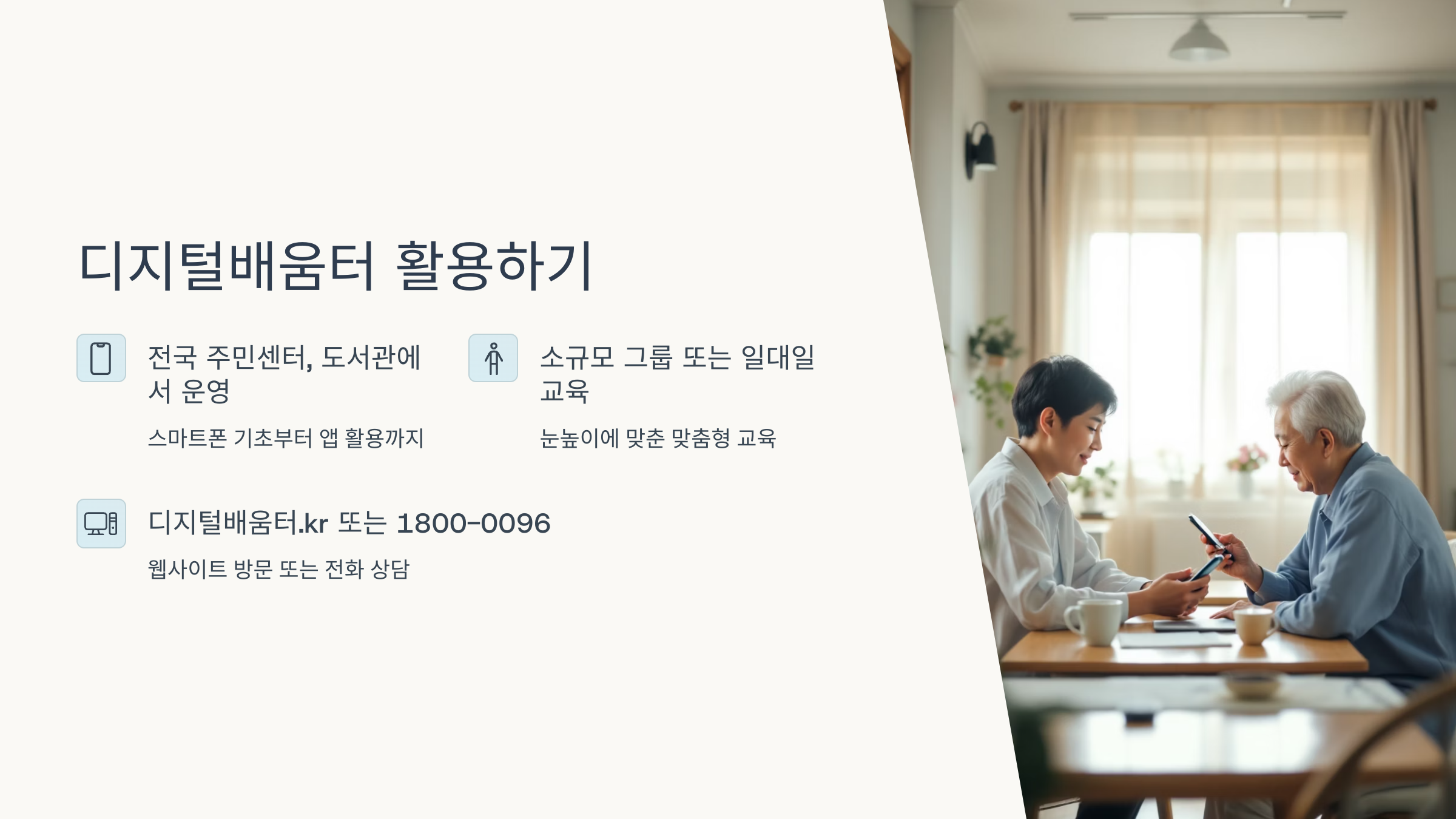 - 온라인 교육 플랫폼: '배움나라'와 같은 공공 온라인 학습 플랫폼이나 유튜브 채널에서도 무료 또는 저렴한 비용으로 디지털 교육 콘텐츠를 이용할 수 있습니다. 검색창에 "스마트폰 강좌", "키오스크 사용법" 등의 키워드를 입력하여 원하는 정보를 찾아보세요.