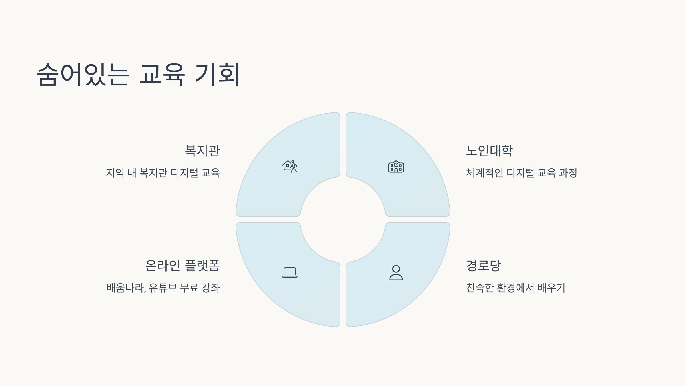 - 복지관, 노인대학, 경로당: 지역 내 복지관, 노인대학, 경로당 등에서도 디지털 교육 프로그램을 운영하는 경우가 많습니다. 해당 기관에 직접 문의하여 정보를 얻어보세요.