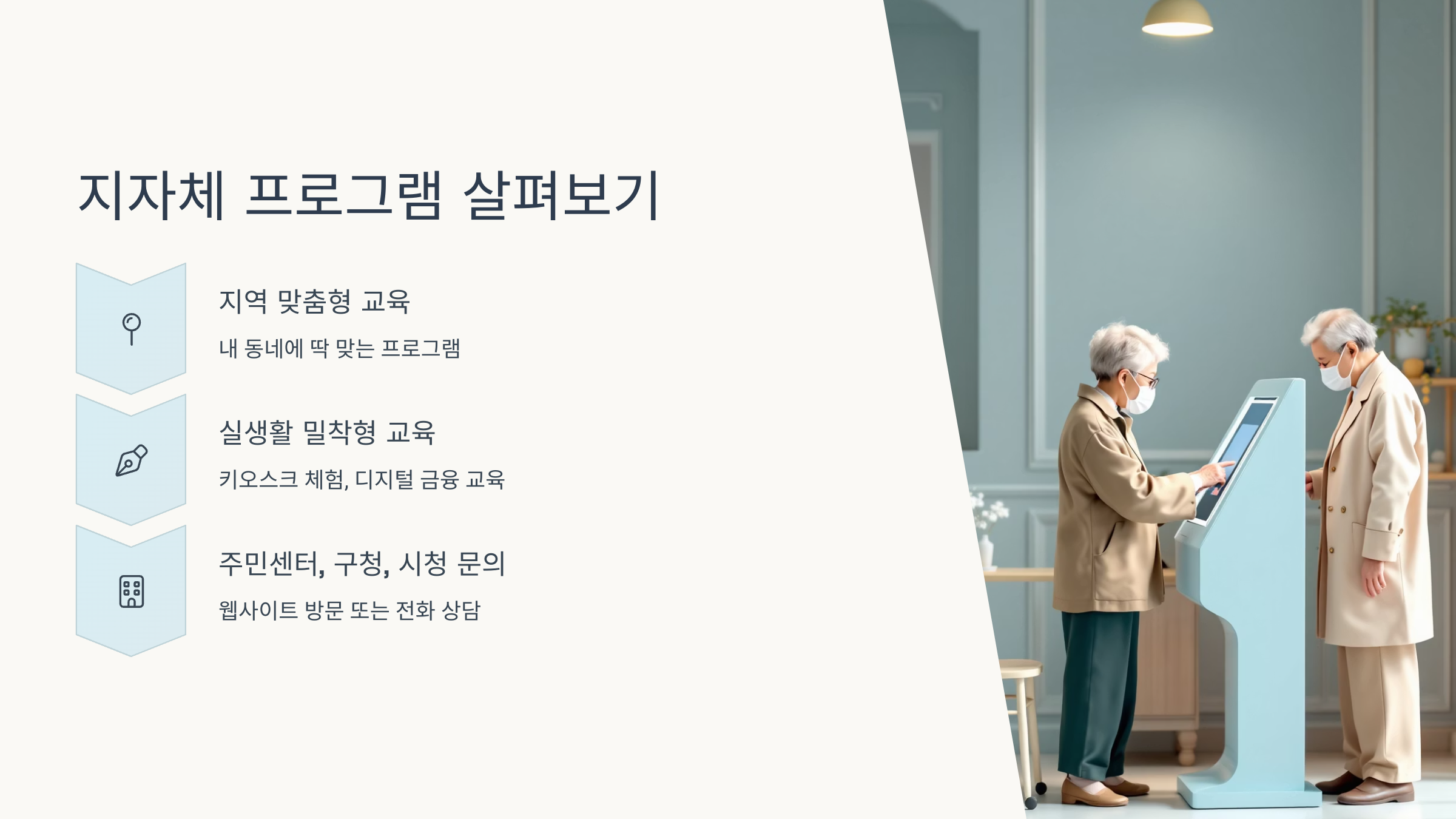 스마트폰 활용 교육부터 키오스크 체험, 디지털 금융 교육까지, 지역 특색에 맞춘 실생활 밀착형 교육 내용이 풍부하게 준비되어 있습니다. 거주 지역 주민센터나 구청, 시청 웹사이트를 방문하거나 전화 문의를 통해 자세한 정보를 확인해 보세요.