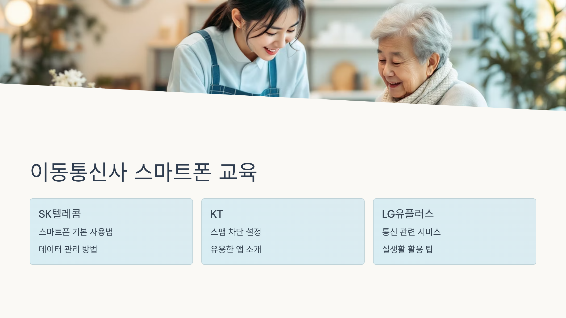 - 교육 내용: 스마트폰 기본 활용, 데이터 관리, 스팸 차단, 통신 관련 서비스 안내 등