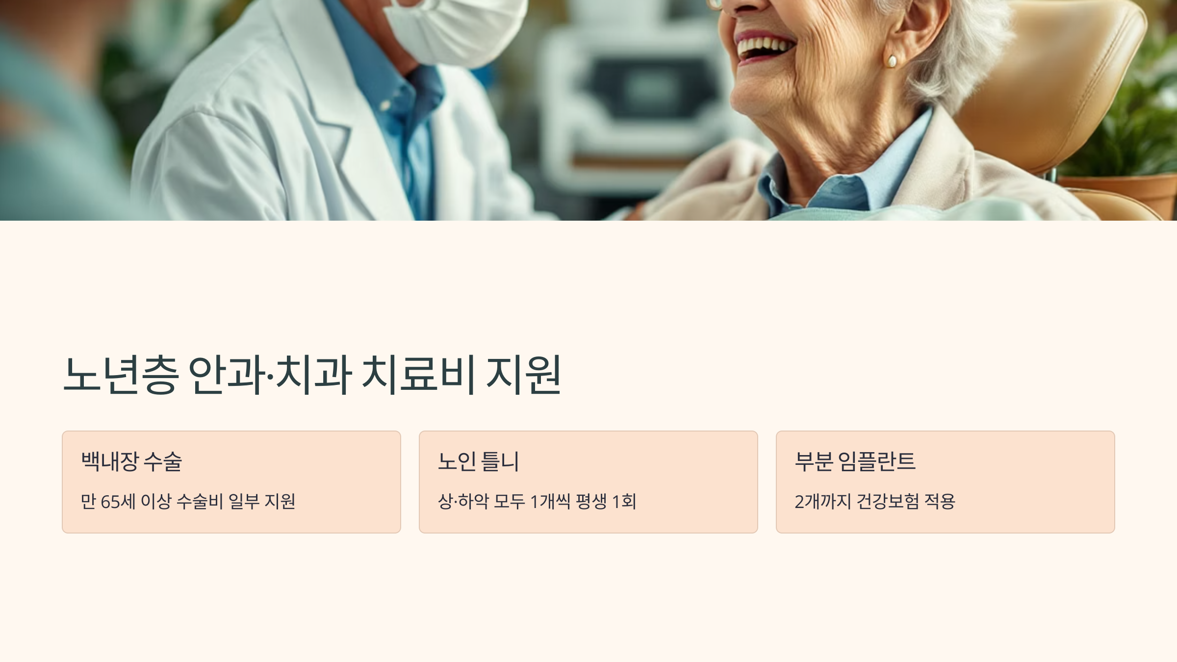 ✔️ 대표 지원 항목 - 만 65세 이상 백내장 수술비 일부 지원 - 노인 틀니: 상·하악 모두 1개씩 평생 1회 - 부분 임플란트: 2개까지 건강보험 적용 - 치과 진료 본인부담금 경감 (건강보험료 기준 적용)