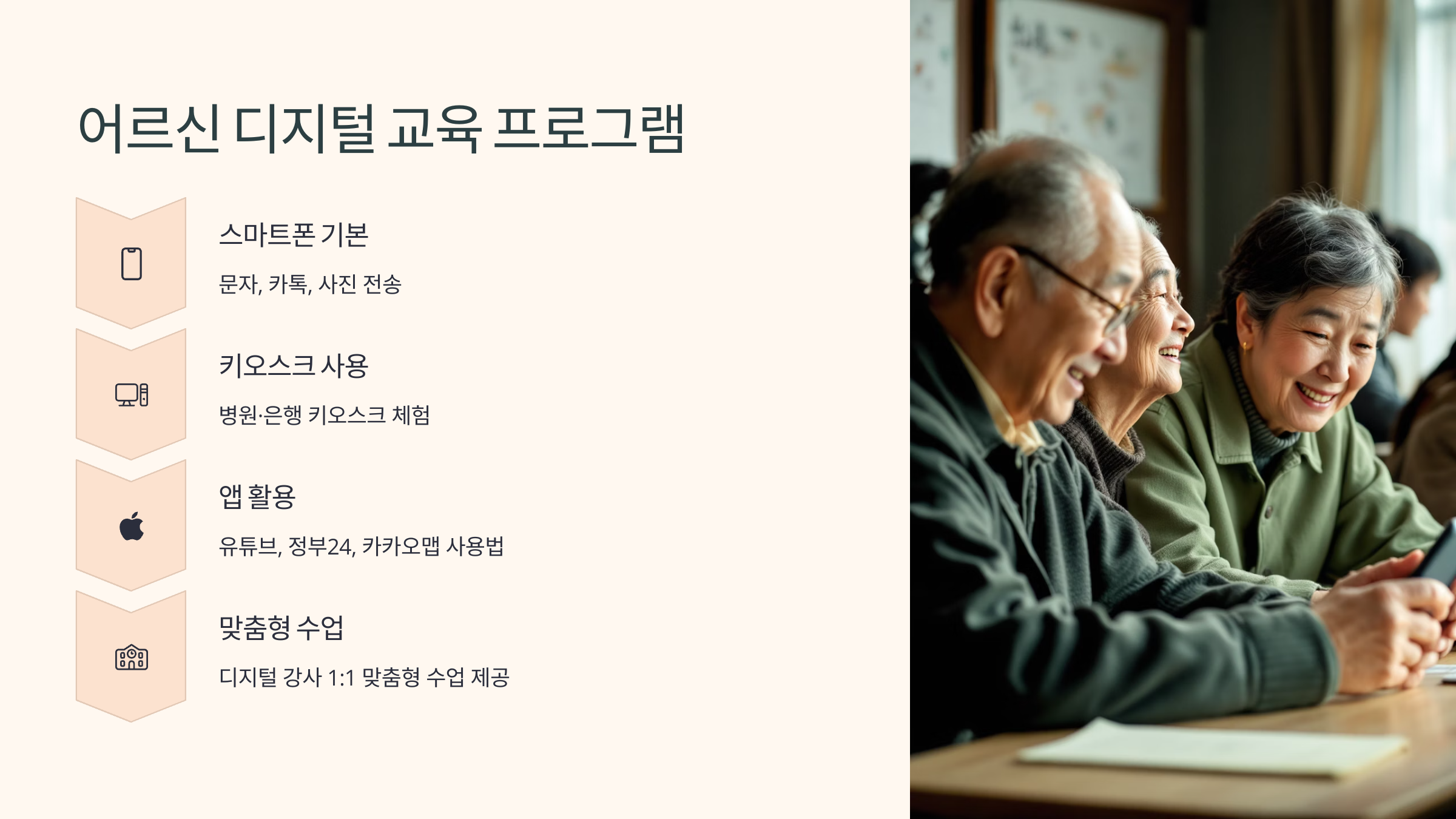 2025년 기준, 과학기술정보통신부와 지자체는 ‘어르신 디지털 배움터’를 전국 3,000곳 이상 운영 중이에요. 이곳에서 스마트폰 기본 조작, 키오스크 사용법, 앱 설치 및 활용까지 무료로 배울 수 있어요.